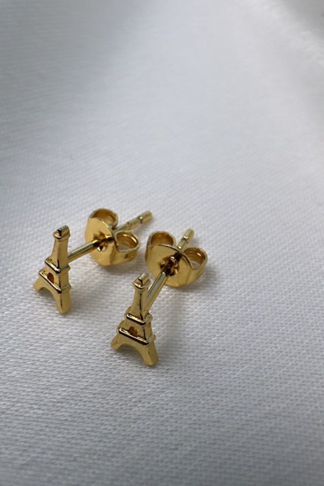 Vergulde oorstekers van O element in de vorm van de Eiffeltoren. De kleine oorbellen hebben een gedetailleerde vormgeving van de iconische toren in een gouden tint.