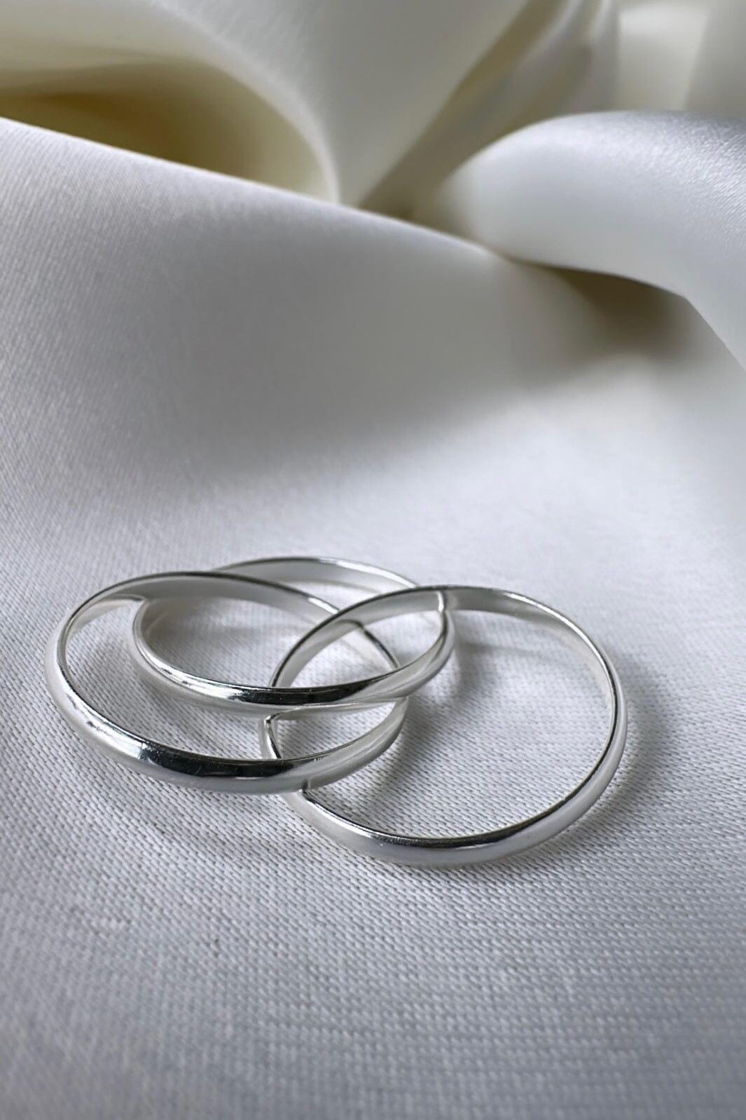 Verzilverd ring van O element met drie verbonden ringen. De ring is gemaakt van messing met een glanzend zilveren oppervlak dat een schoon en minimalistisch ontwerp creëert.
