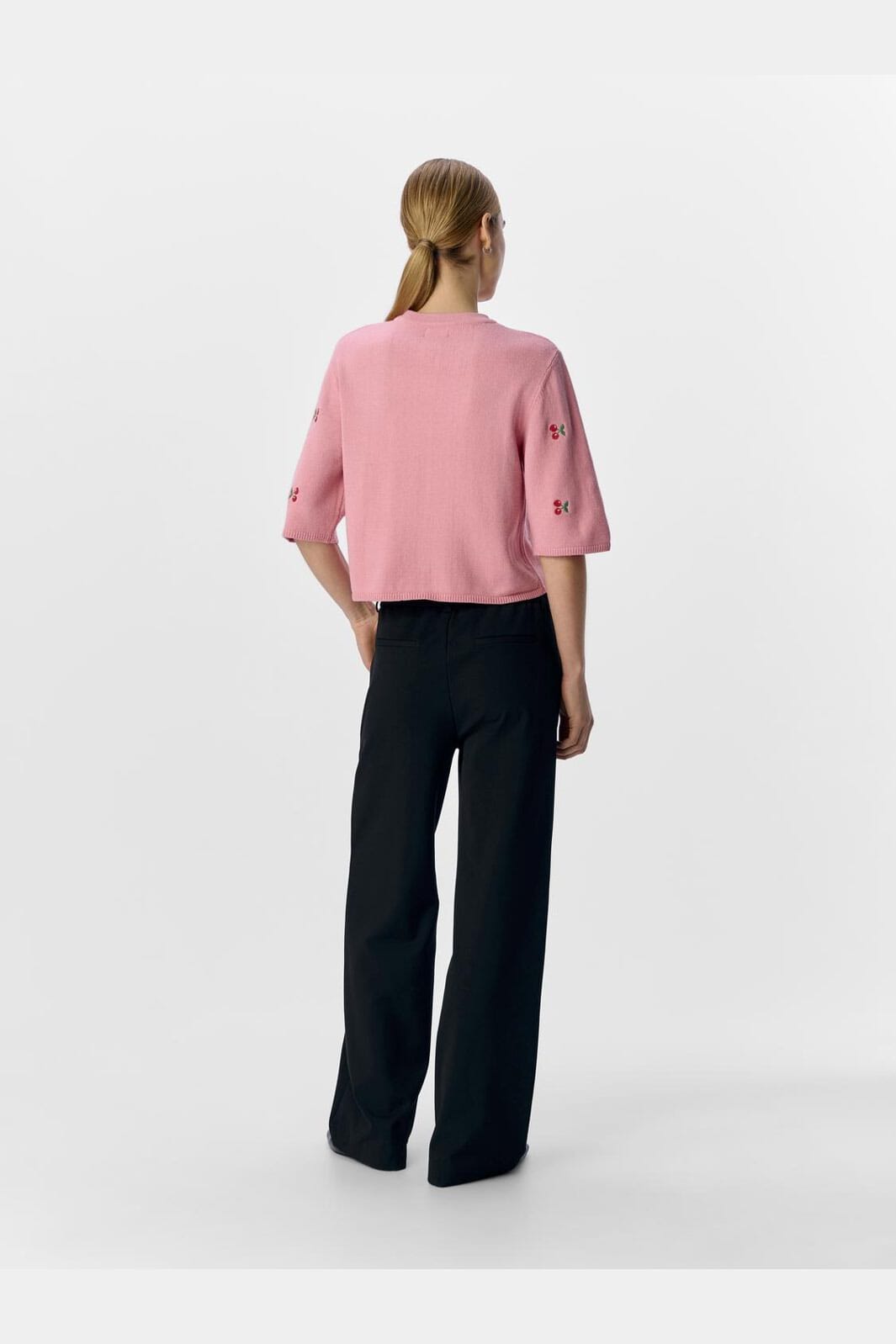 Roze cardigan van Object met kersenborduursel over het hele ontwerp. Het heeft een ronde hals en 3/4-mouwen met ribgebreide manchetten. De knopen aan de voorkant maken het gemakkelijk om aan en uit te trekken.