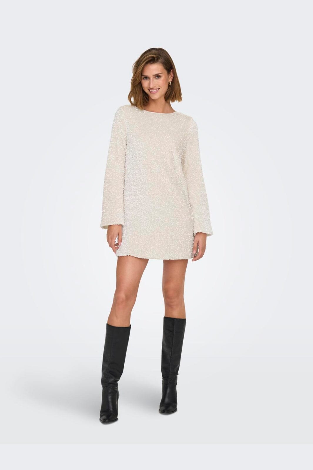 Paillette jurk van Only in een lichte crème kleur. De jurk heeft lange mouwen bedekt met pailletten en een zwarte strik op de achterkant.