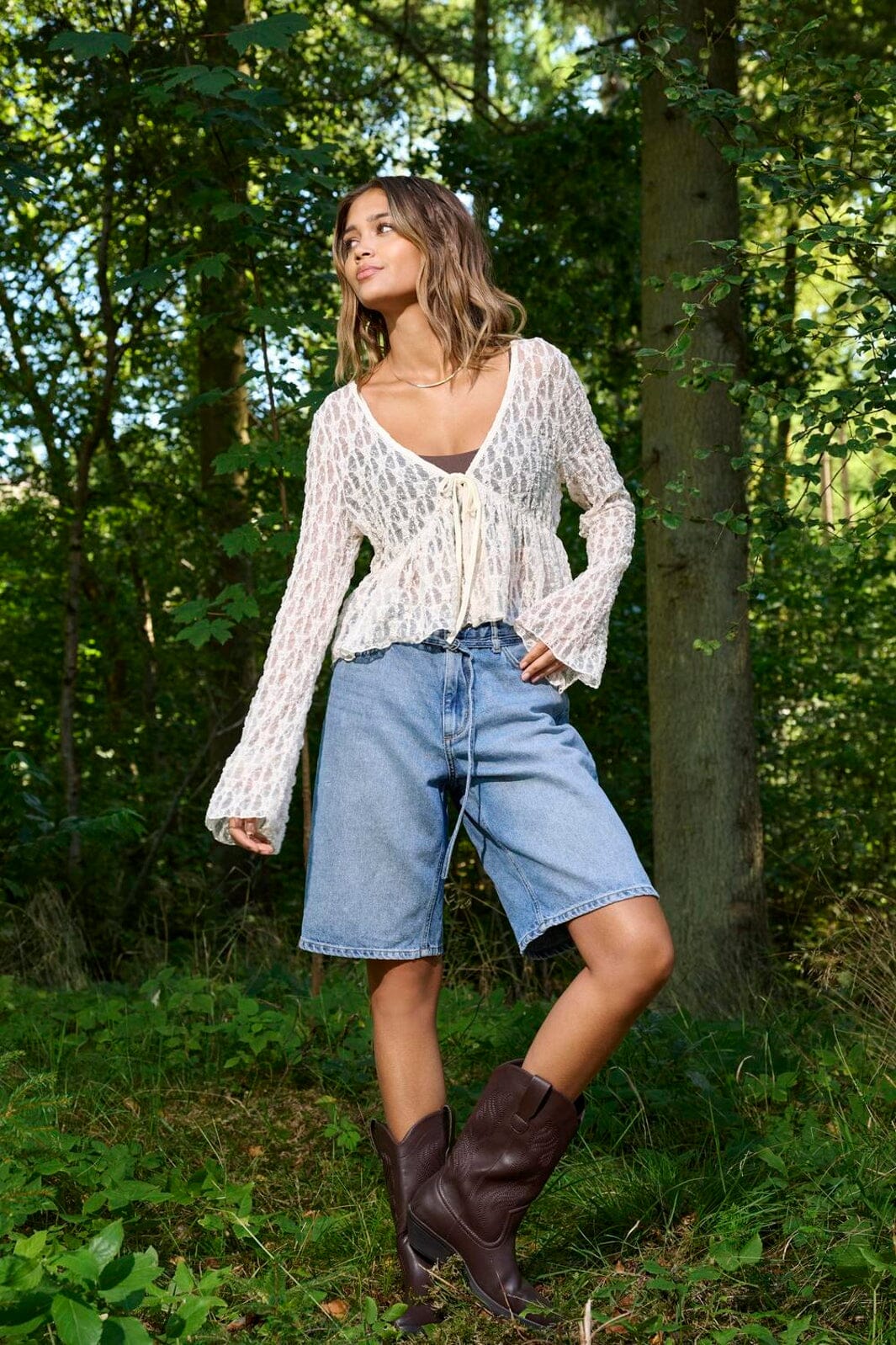 Crèmekleurig kanten vest van Only met V-hals en lange mouwen. Het vest heeft een strikceintuur aan de voorkant en kanten details over het hele oppervlak.