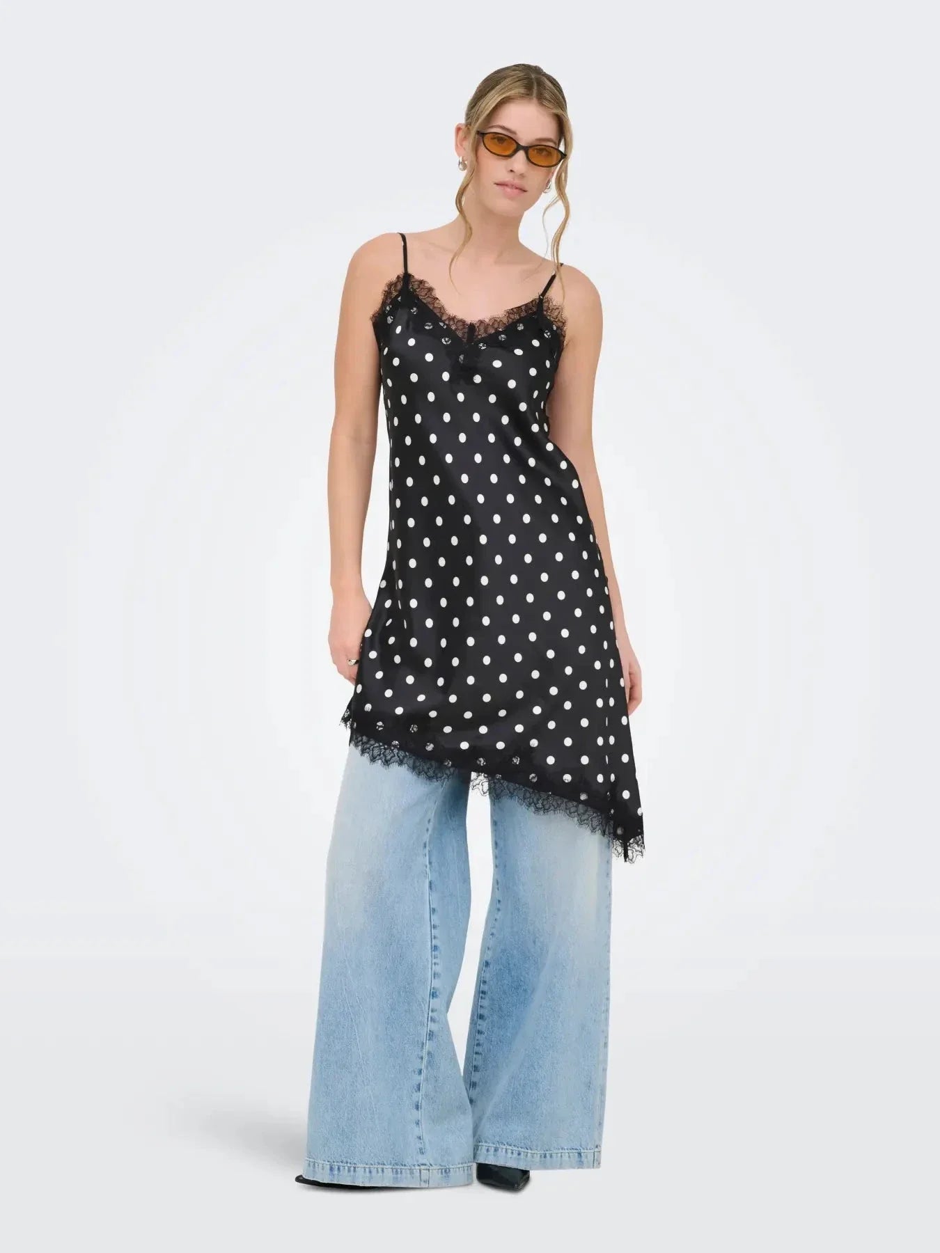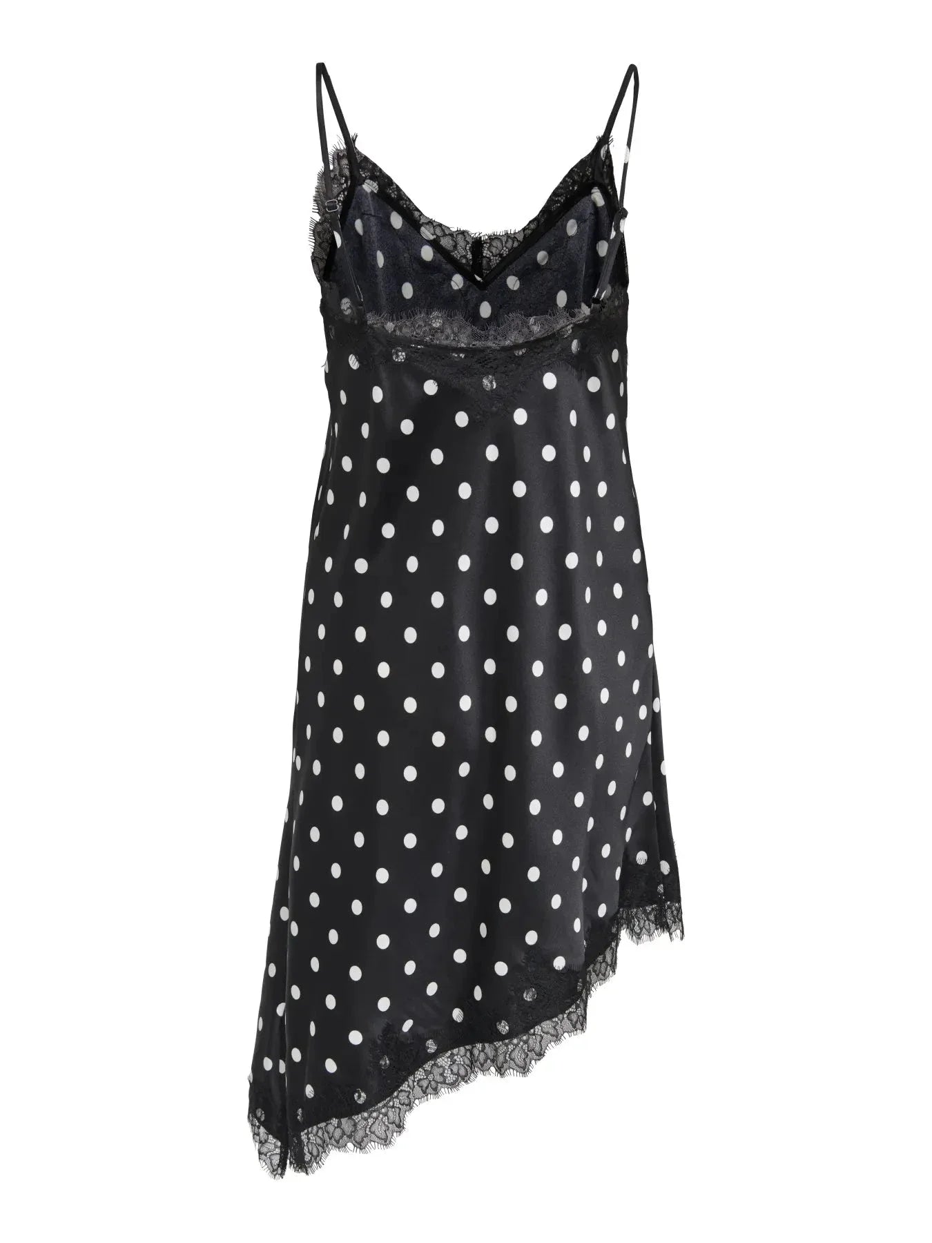 Zwarte satijnen jurk van Only met witte stippen en kanten afwerking. De jurk heeft dunne spaghettibandjes en een asymmetrische zoom met kanten rand.