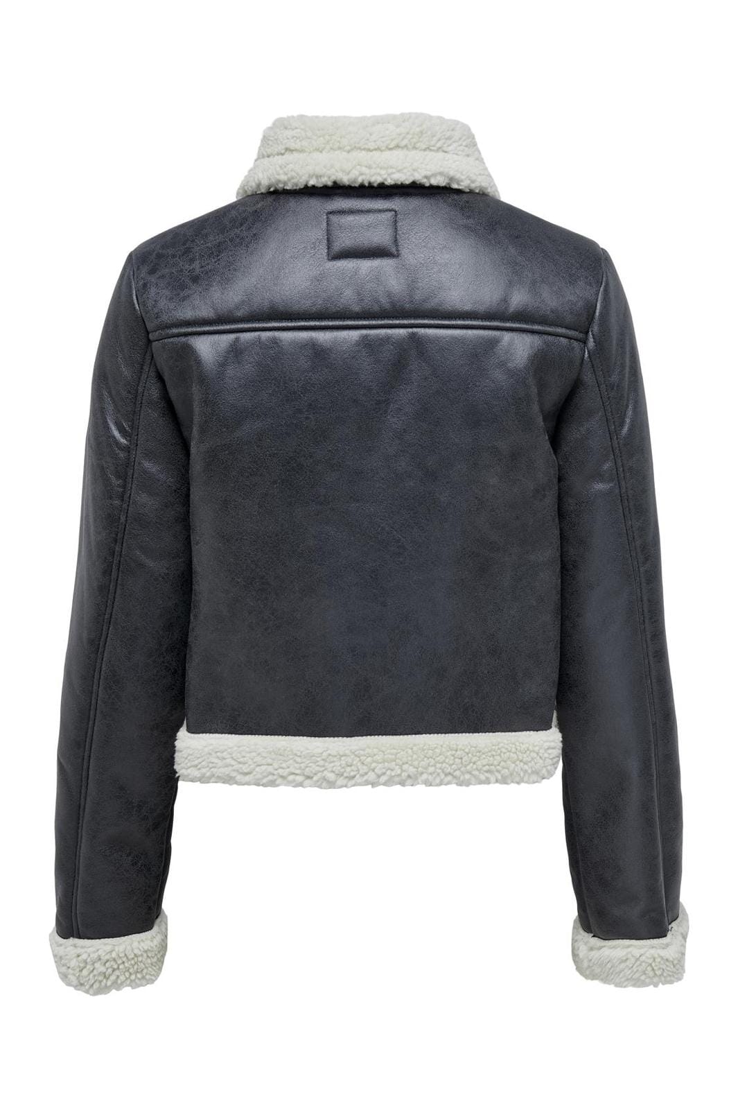 Grijze jas van Only met cropped lengte en shearling voering. De jas heeft een gespreide kraag met een lichte shearling rand die contrasteert met de donkere buitenkant.