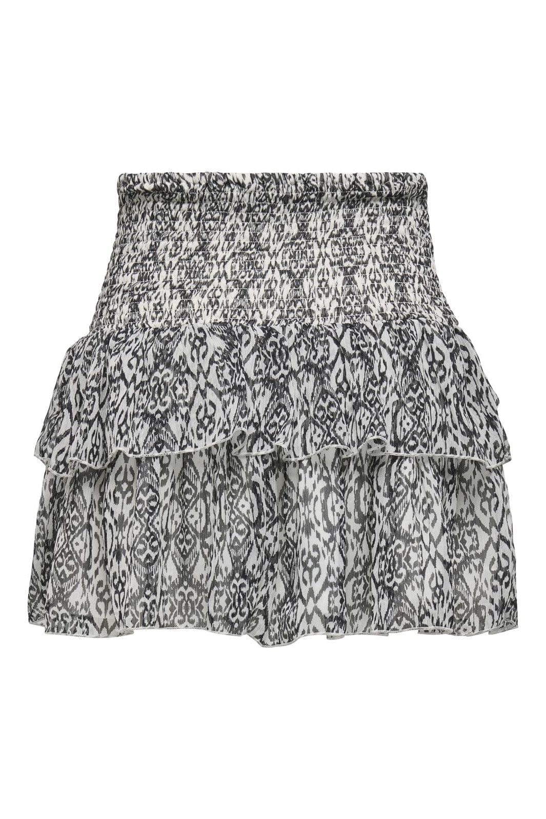 Korte rok van Only met zwart-wit ikatmuster. De rok heeft een gelaagd ontwerp met ruches en smockdetails die beweging in de stof creëren.