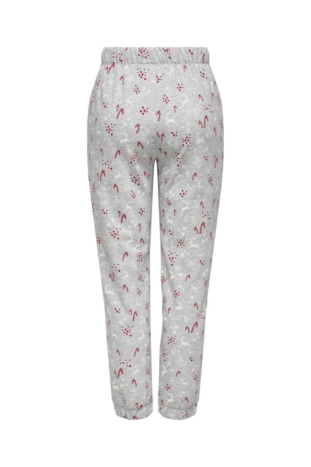 Lichtgrijze sweatpants van Only met een feestelijk kerstpatroon. De broek heeft kleine zuurstokken, harten en rendieren op een gemêleerde achtergrond.