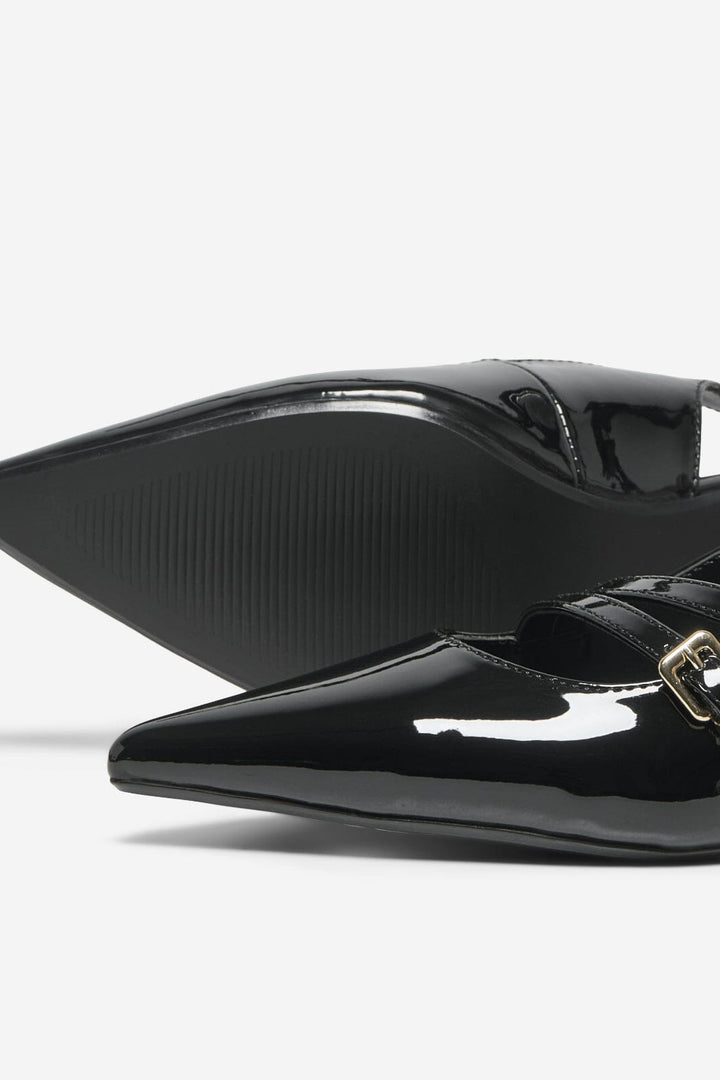 Zwarte slingback-pumps met spitse neus en lage hak. De schoen heeft een glanzend oppervlak van synthetisch leer en een praktische gesp aan de achterkant die goede ondersteuning biedt.