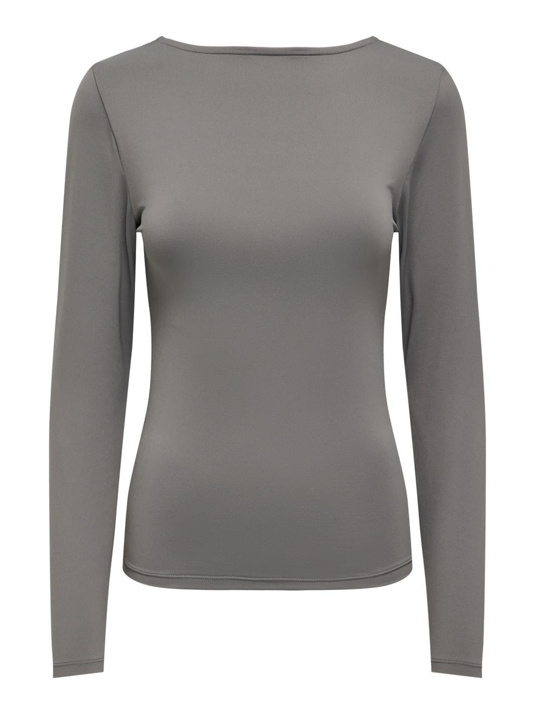 Langarmtop van Only in de grijze Thunderstorm kleur. Het topje heeft een speciaal 2-wegs ontwerp met een diepe halslijn en een slim fit pasvorm die de lichaamslijnen volgt.