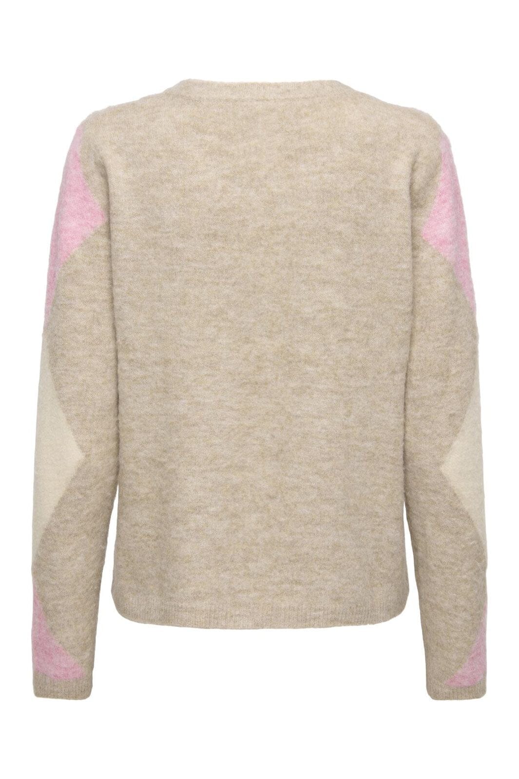 Cardigan van Only met geometrisch patroon in roze, crème en beige. Hij heeft een ronde hals, lange mouwen en gouden knopen aan de voorkant.