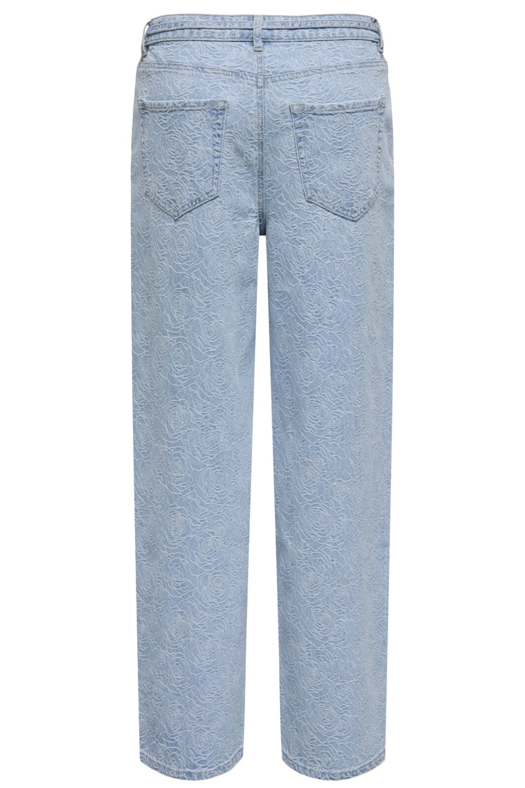 Lichtblau denim jeans van Only met ingeweven bloemenpatroon. De broek heeft een rechte pasvorm en enkel lengte met een koord en rits in de taille.