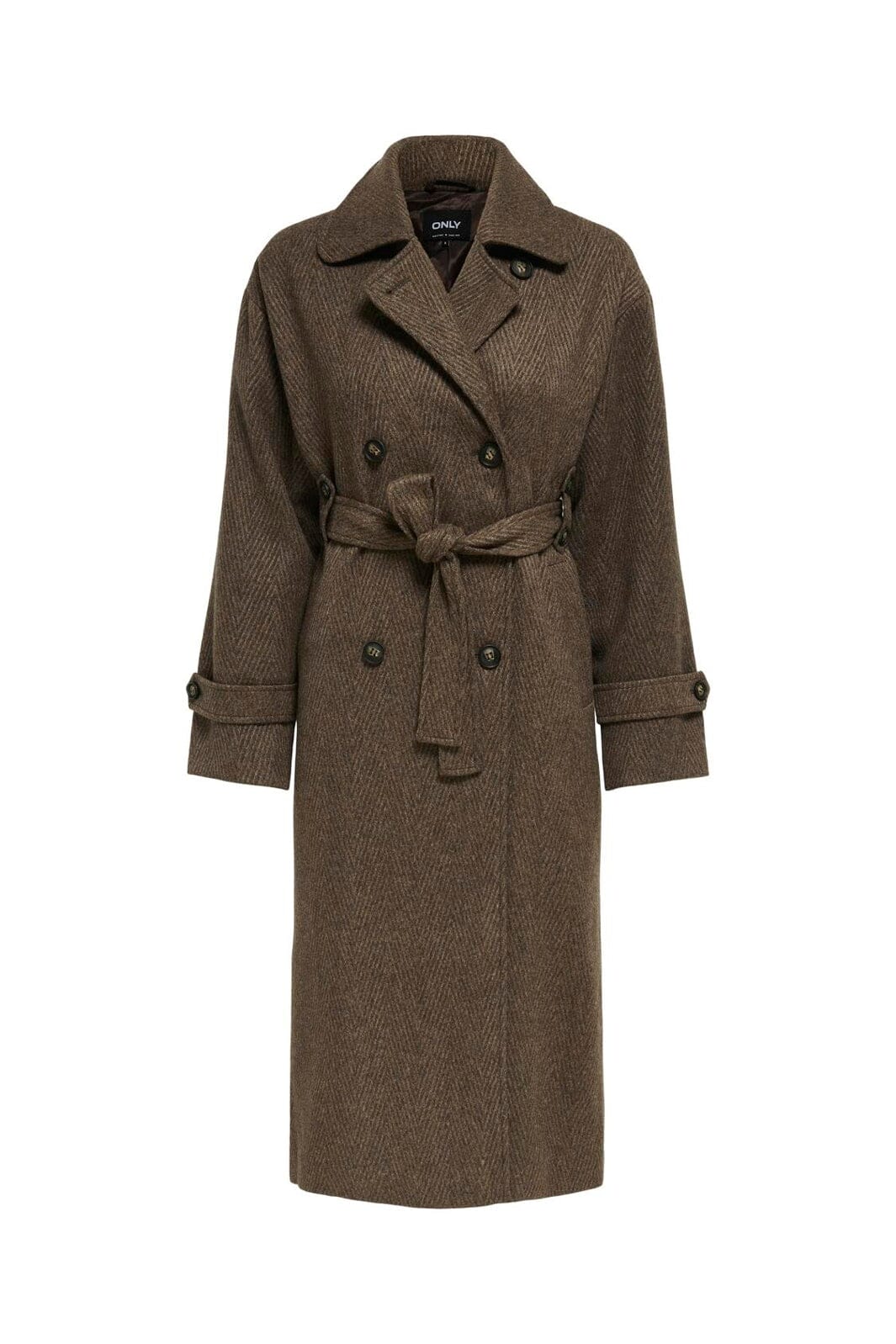 Bruine jas van Only met visgraatpatroon. Gemaakt van geweven materialen met reverskraag, knopen aan de voorkant en een riem in de taille. De mouwen hebben verstelbare randen met knopen.