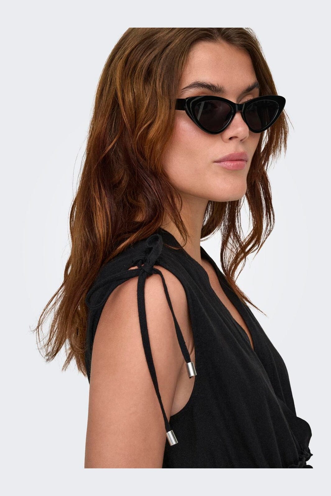 Lange zwarte jurk van Only, gemaakt van een mix van viscose en linnen. De jurk heeft een V-hals, is mouwloos en heeft een trekkoord in de taille.