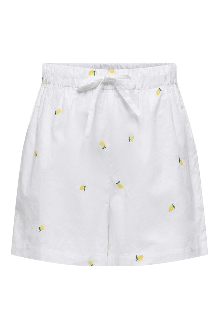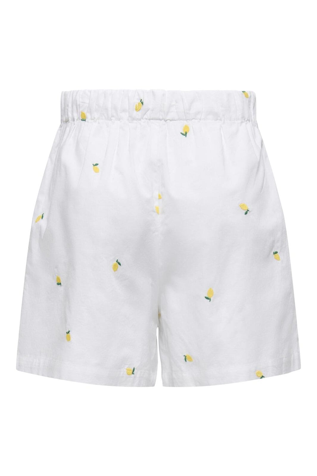 Witte shorts van Only met geborduurde citroenen. Hoge taille shorts met elastiek en koord in de taille. Regular fit in bovenbeenlengte met een zomerse uitstraling.