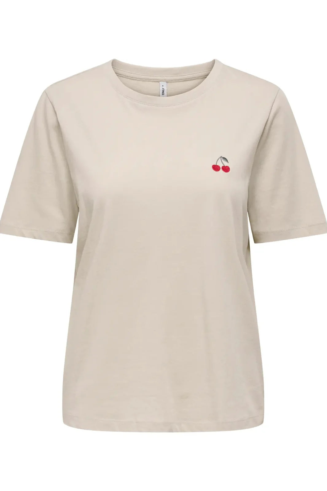 Beige T-shirt van Only, gemaakt van 100% biologisch katoen. De T-shirt heeft een ronde halslijn en korte mouwen met een kleine kersenborduursel op de borst.