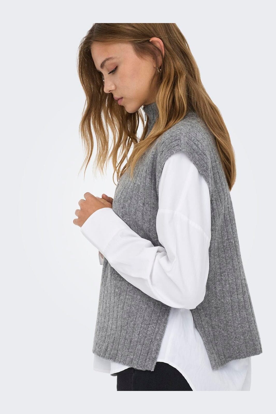 Mouwloos gebreid vest van ONLY in gemêleerd grijs. Het vest heeft een hoge kraag met ritssluiting en een geribde textuur.