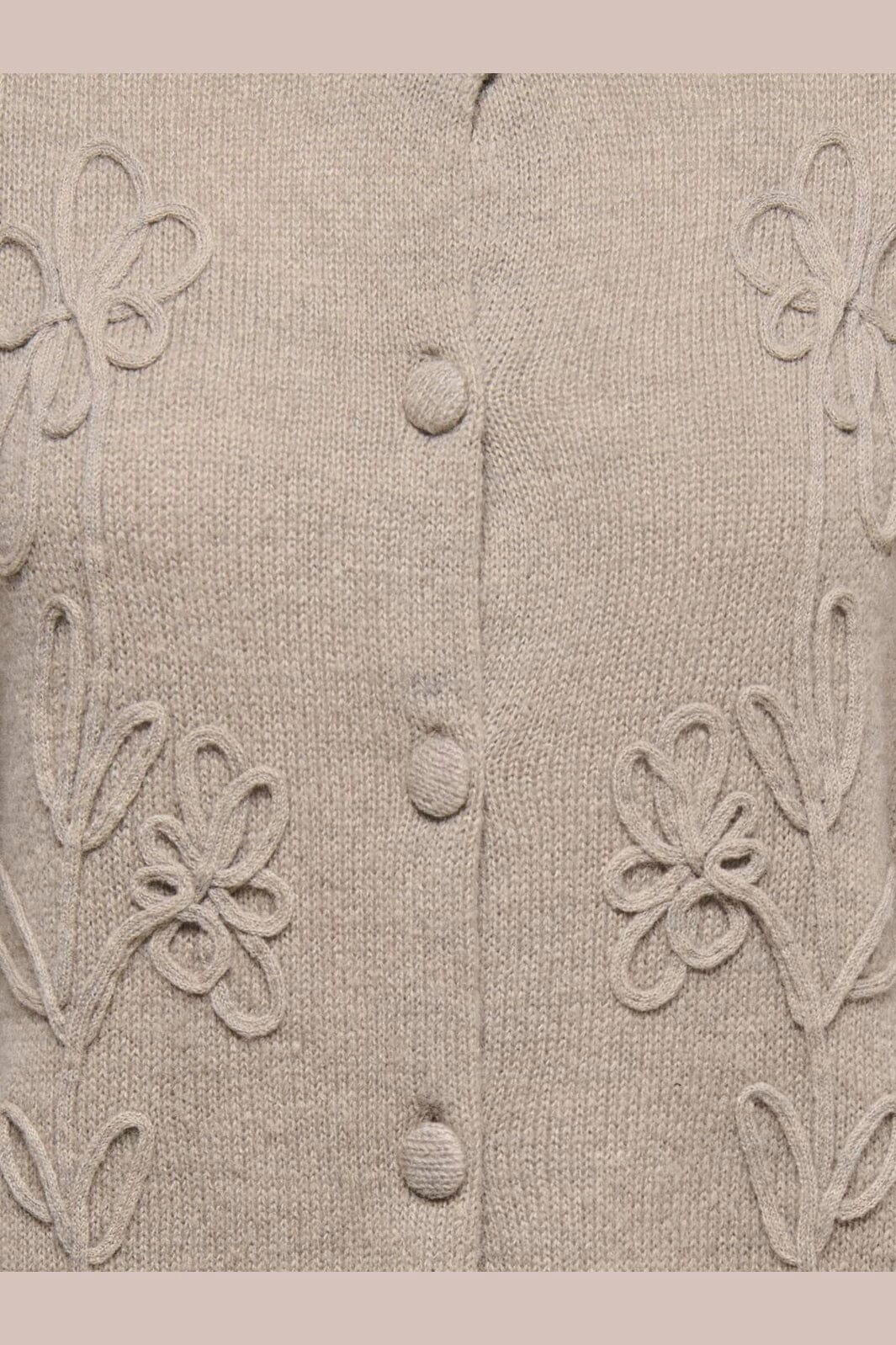 Een gebreid vest van Only in een licht beige-bruine kleur. Het vest heeft geborduurde bloemmotieven, een ronde hals en wordt gesloten met knopen.