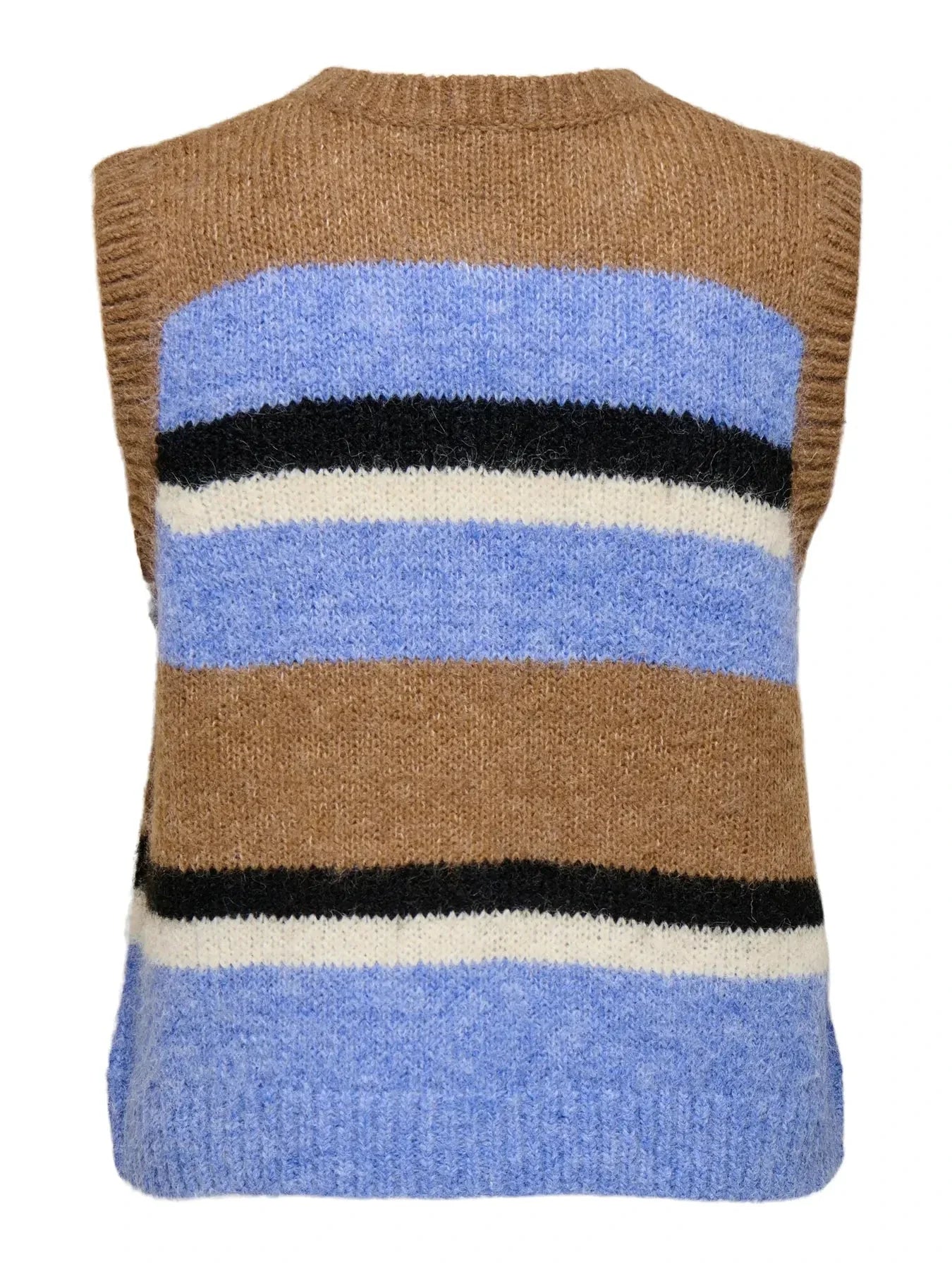 Gestreepte vest van Only met brede horizontale strepen in bruin, lichtblauw, zwart en wit. De vest heeft zwarte knopen en een ronde halsuitsnijding.
