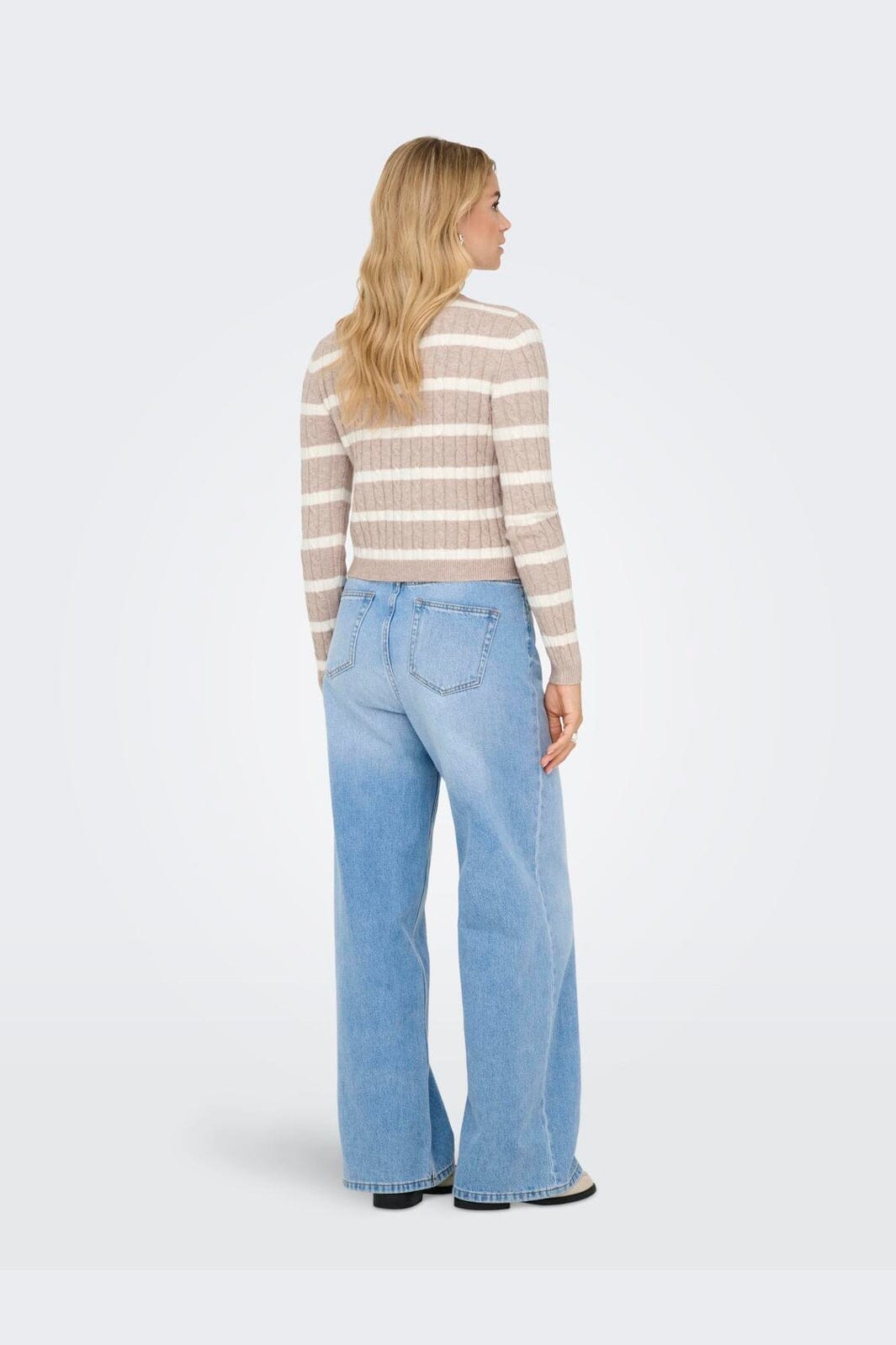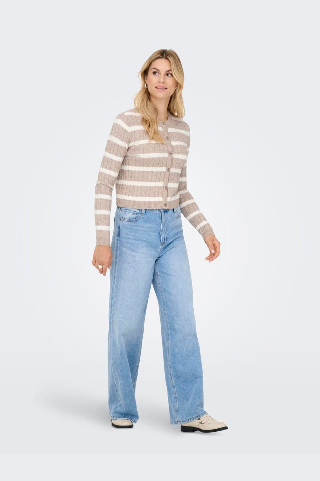 Gestreepte cardigan van Only met kabelbreipatroon in beige en crème-witte tinten. De cardigan heeft knoopsluiting en lange mouwen met ribgebreide manchetten.
