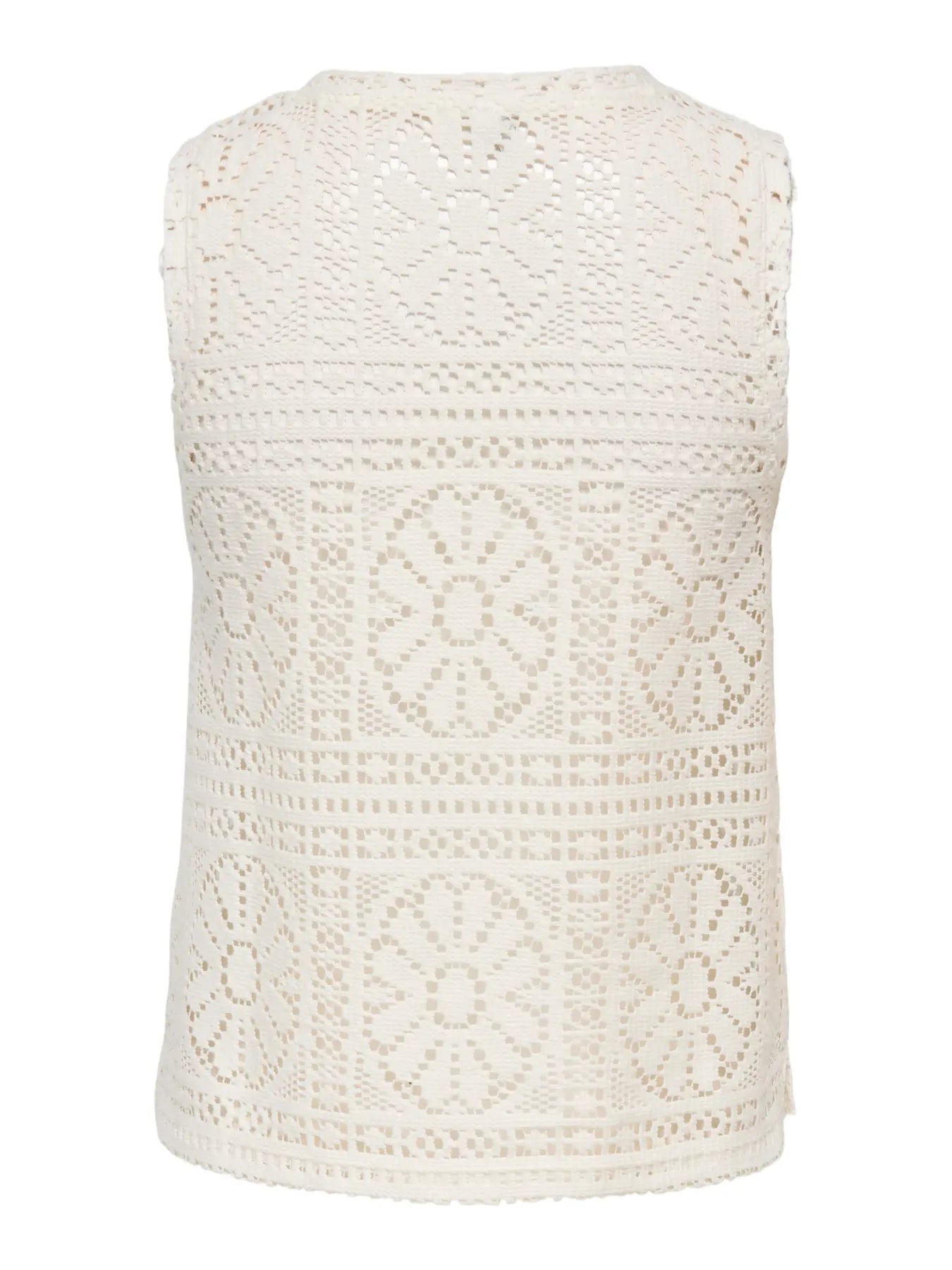 Mouwloze tanktop van Only in een lichte crèmekleur met een doorlopend kantpatroon. De top heeft een ronde halslijn en een regular fit-pasvorm.