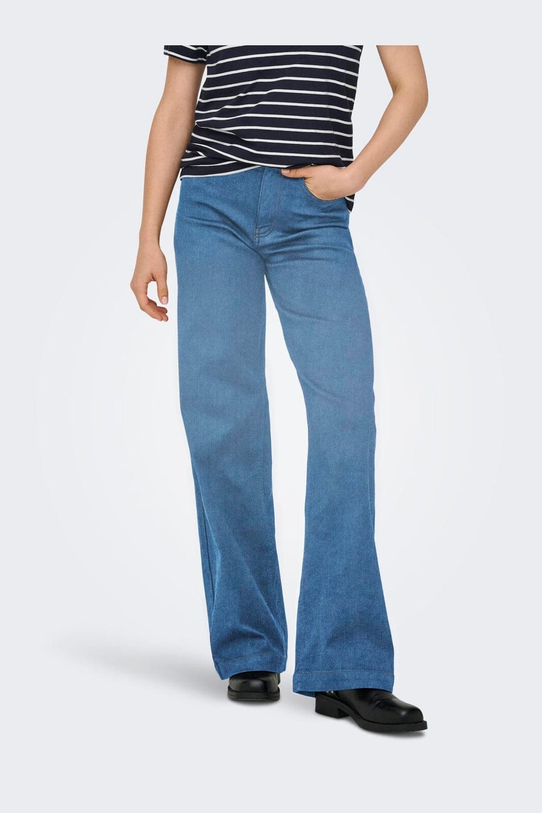 Brede jeans van Only in middelblauwe denim. Ze hebben een hoge taille en wijde benen van heup tot enkel. Ontworpen met een klassieke vijf-pocketstijl en riemlussen.
