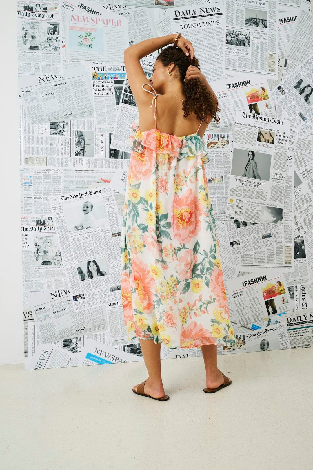 Bloemige jurk van Only met grote roze en gele bloemen op een witte achtergrond. Het heeft een gerimpelde halslijn en verstelbare schouderbanden. De jurk komt tot halverwege de kuit.