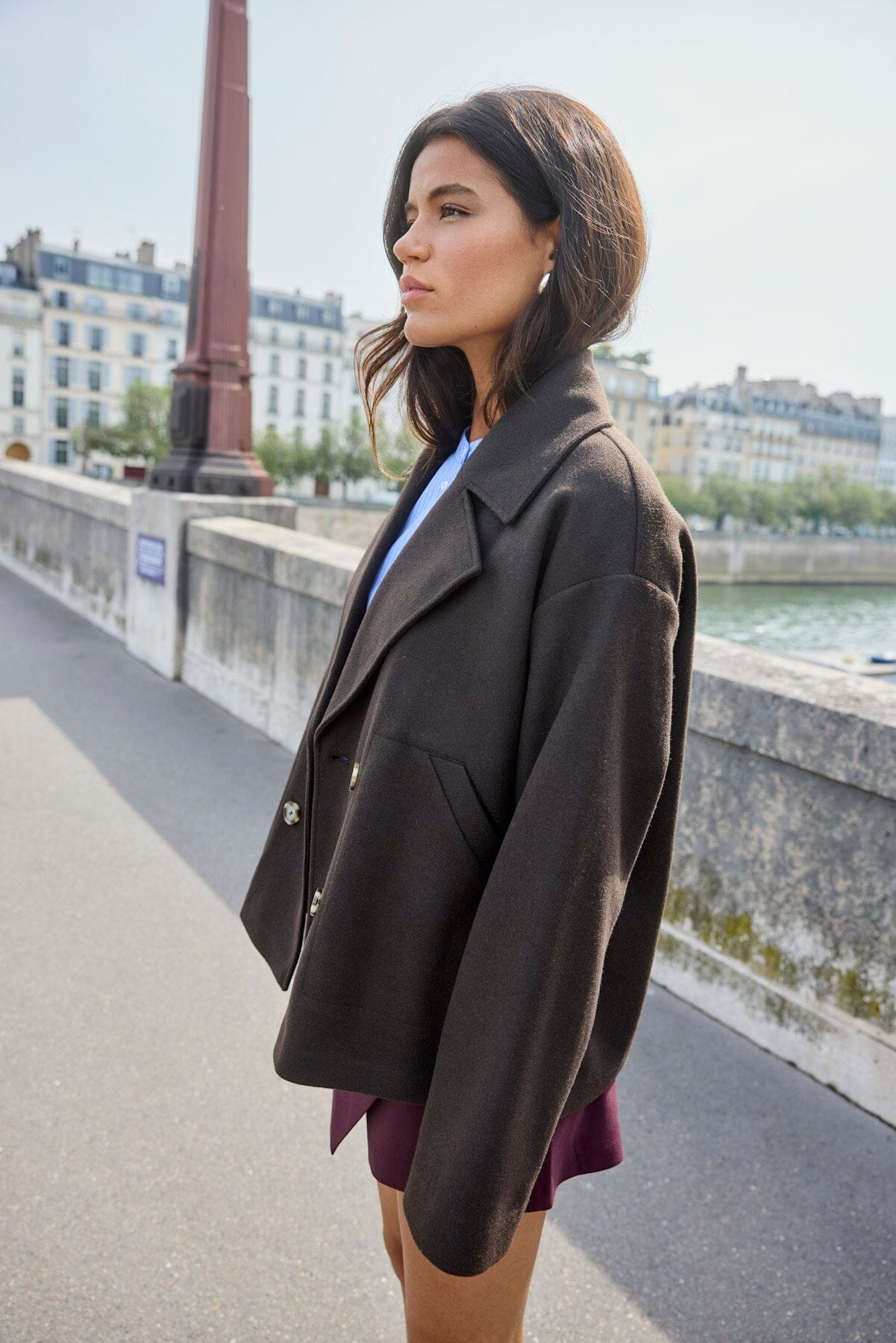 Donkerbruine jas van Only met dubbele knoopsluiting. Hij heeft een brede kraag en lange mouwen die goede bedekking bieden. De zijzakken maken de jas praktisch voor dagelijks gebruik.