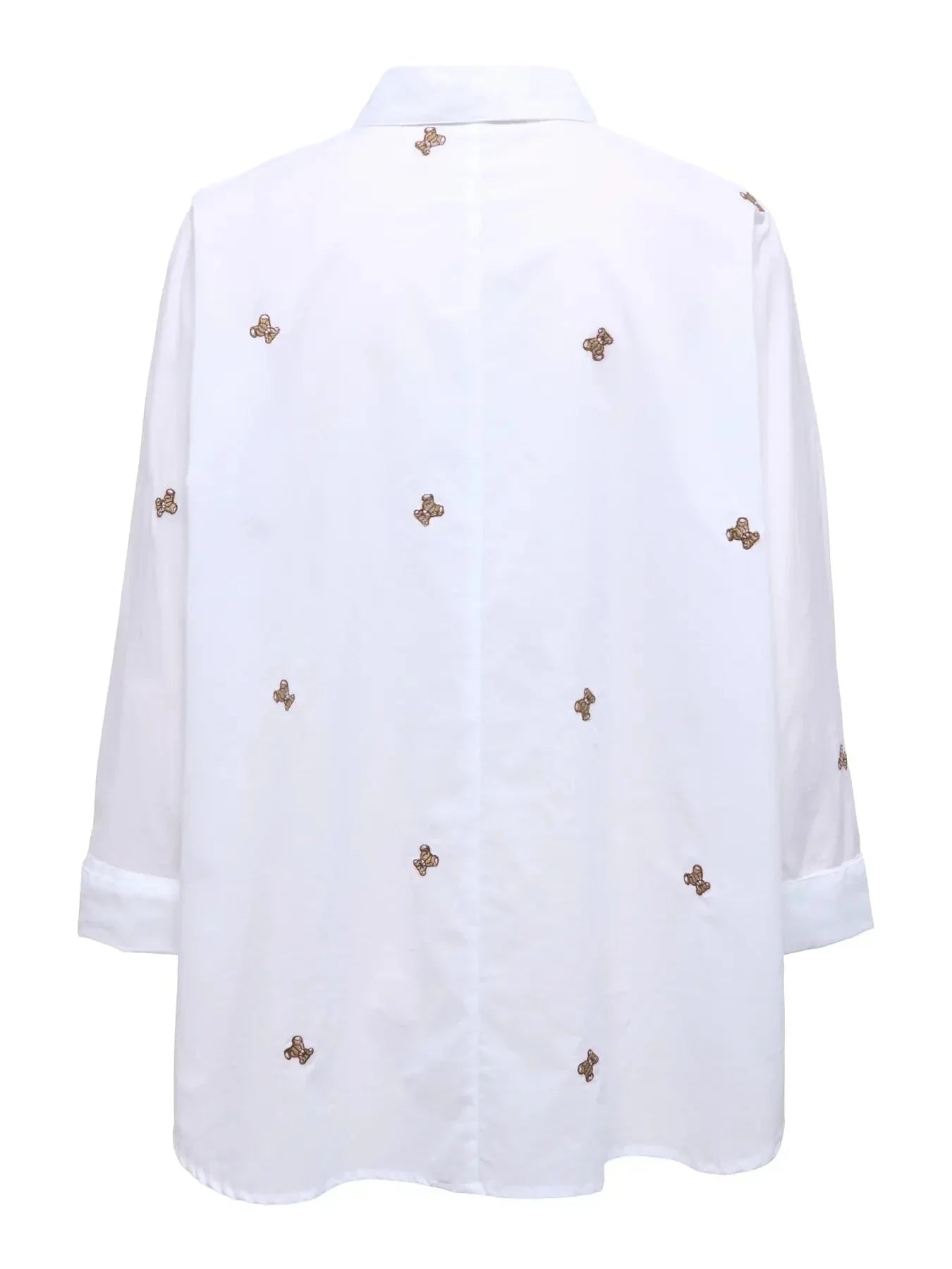 Wit overhemd van Only met kleine geborduurde teddybeermotieven. Het overhemd heeft een boxy fit en sluit met knopen aan de voorkant.