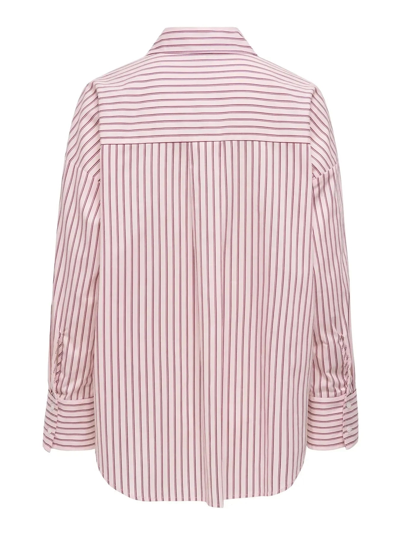 Een gestreept shirt van Only met roze en bordeauxrode strepen op een witte achtergrond. Het shirt heeft een knoopsluiting, lange mouwen en een klassieke overhemdkraag.