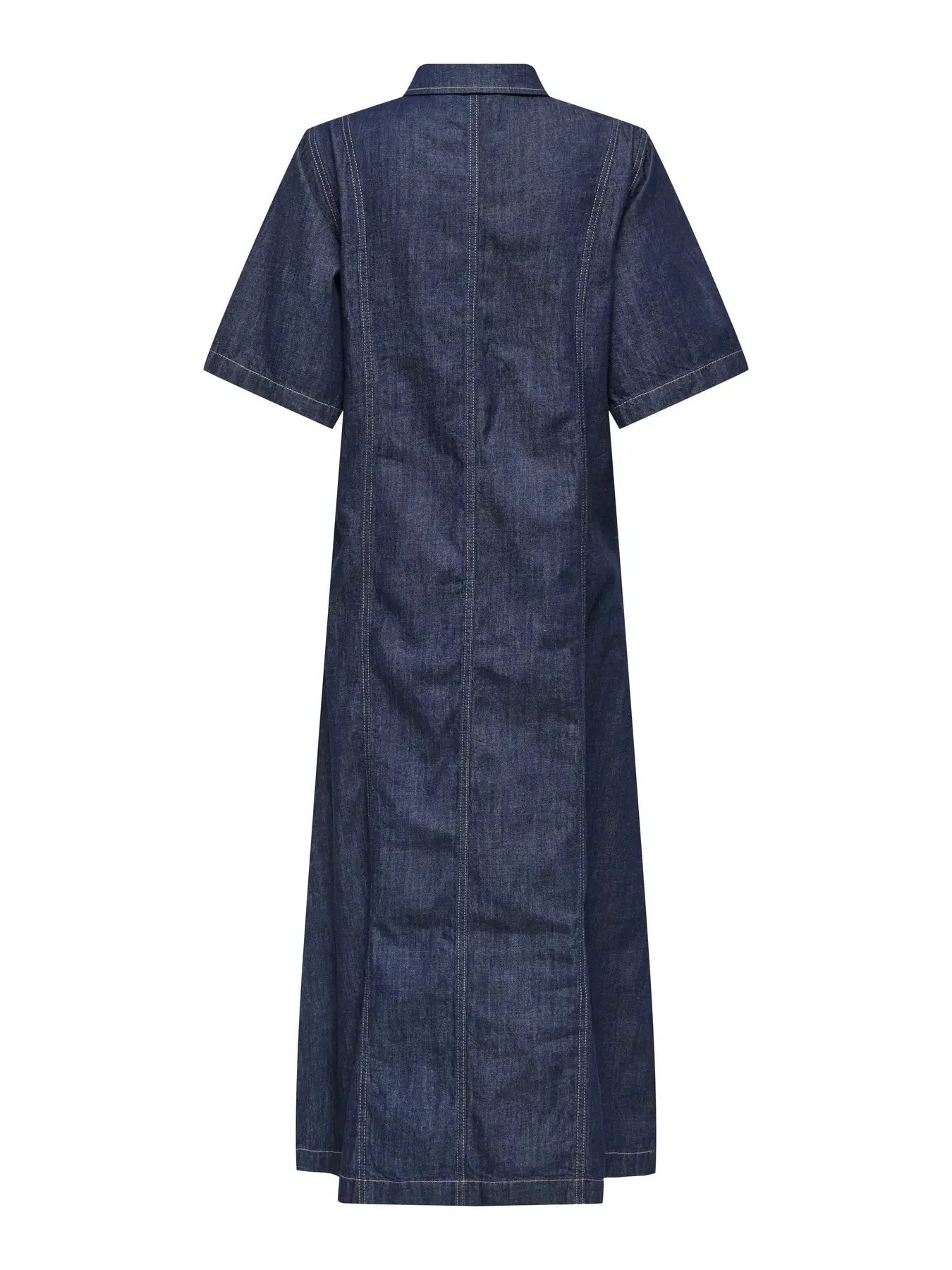 Denimjurk van Only in donkerblauwe denim. De jurk heeft een midi-lengte, korte mouwen en een klassieke overhemdkraag met knoopsluiting aan de voorkant.