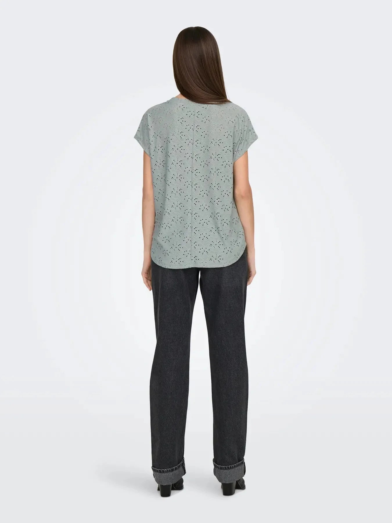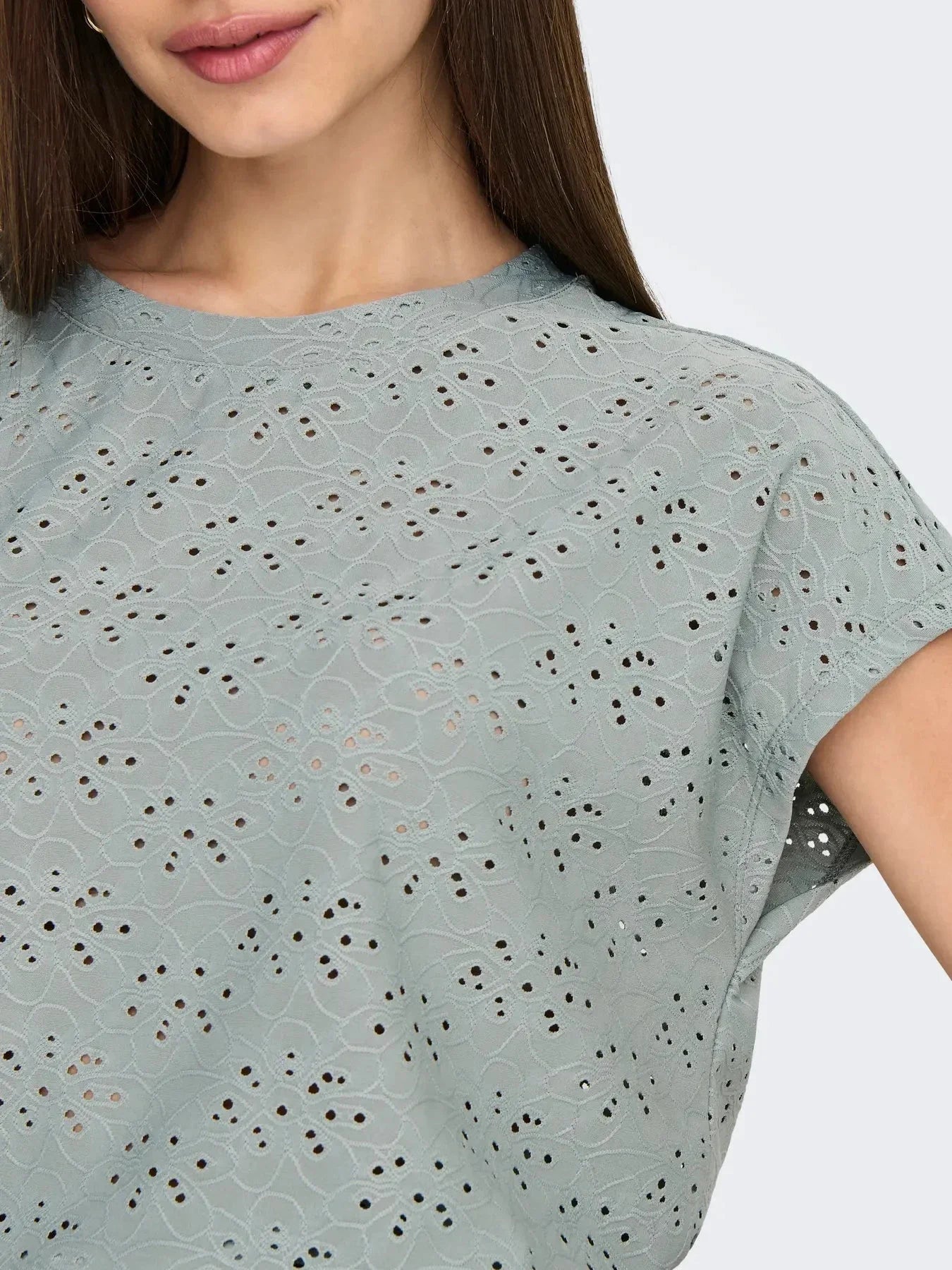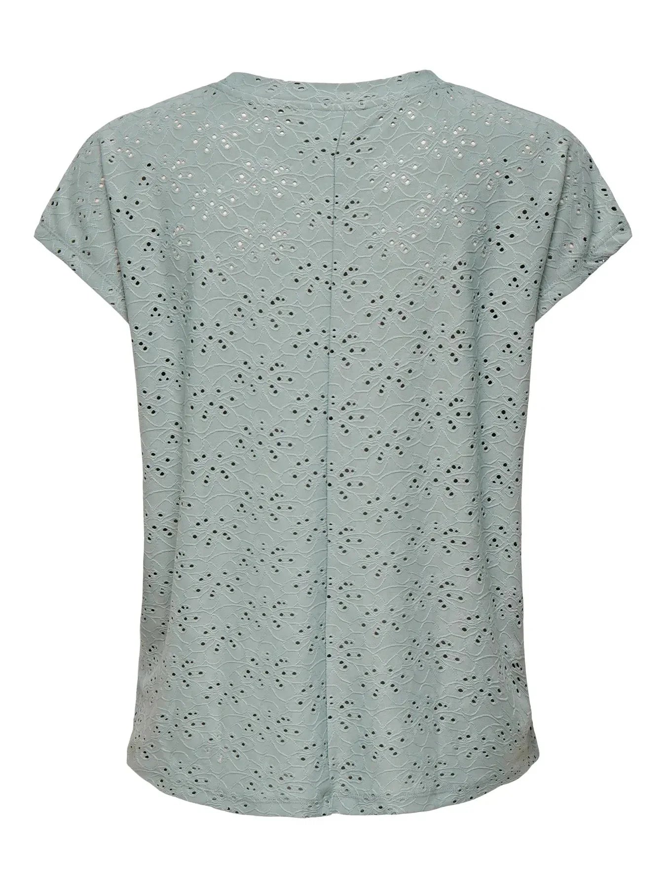 Kort mouwentop van Only in licht blauwgroen met een gaatjespatroon over de hele top. Hij heeft een ronde halslijn en een regular fit-pasvorm.