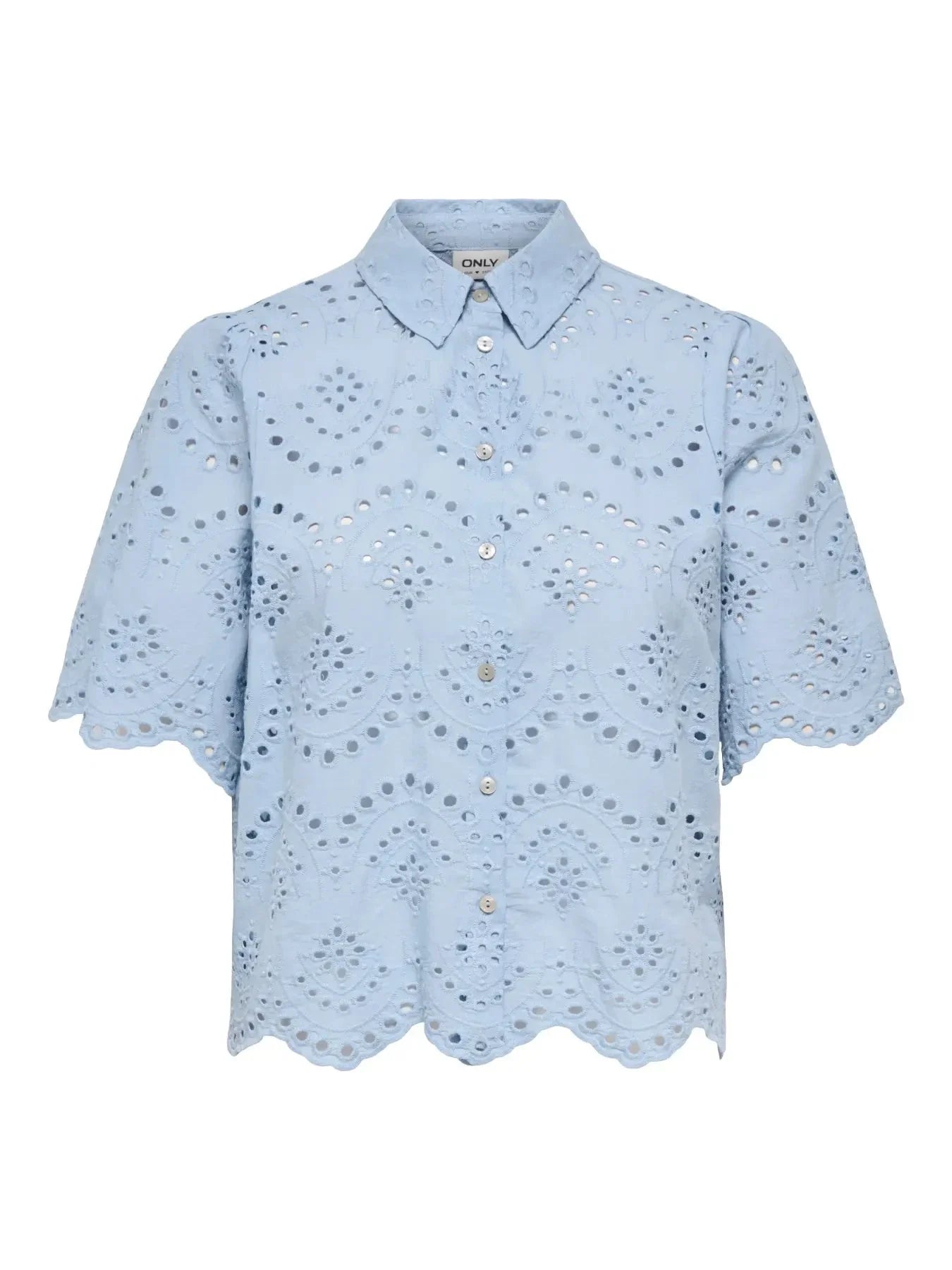 Een kortemdoverhemd van Only in lichtblauw katoen. Het overhemd heeft geborduurde opengewerkte patronen, een knoopsluiting aan de voorkant en een golvende rand bij de mouwen en aan de onderkant.
