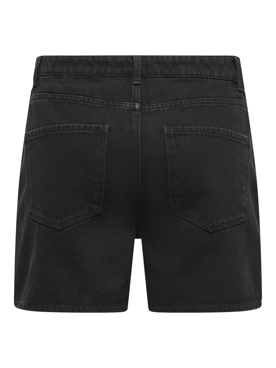 Zwarte denimshorts met hoge taille en mom-fit van Only. De shorts hebben een klassiek vijf-pocket ontwerp met riemlussen en sluiten met een knoop en rits.