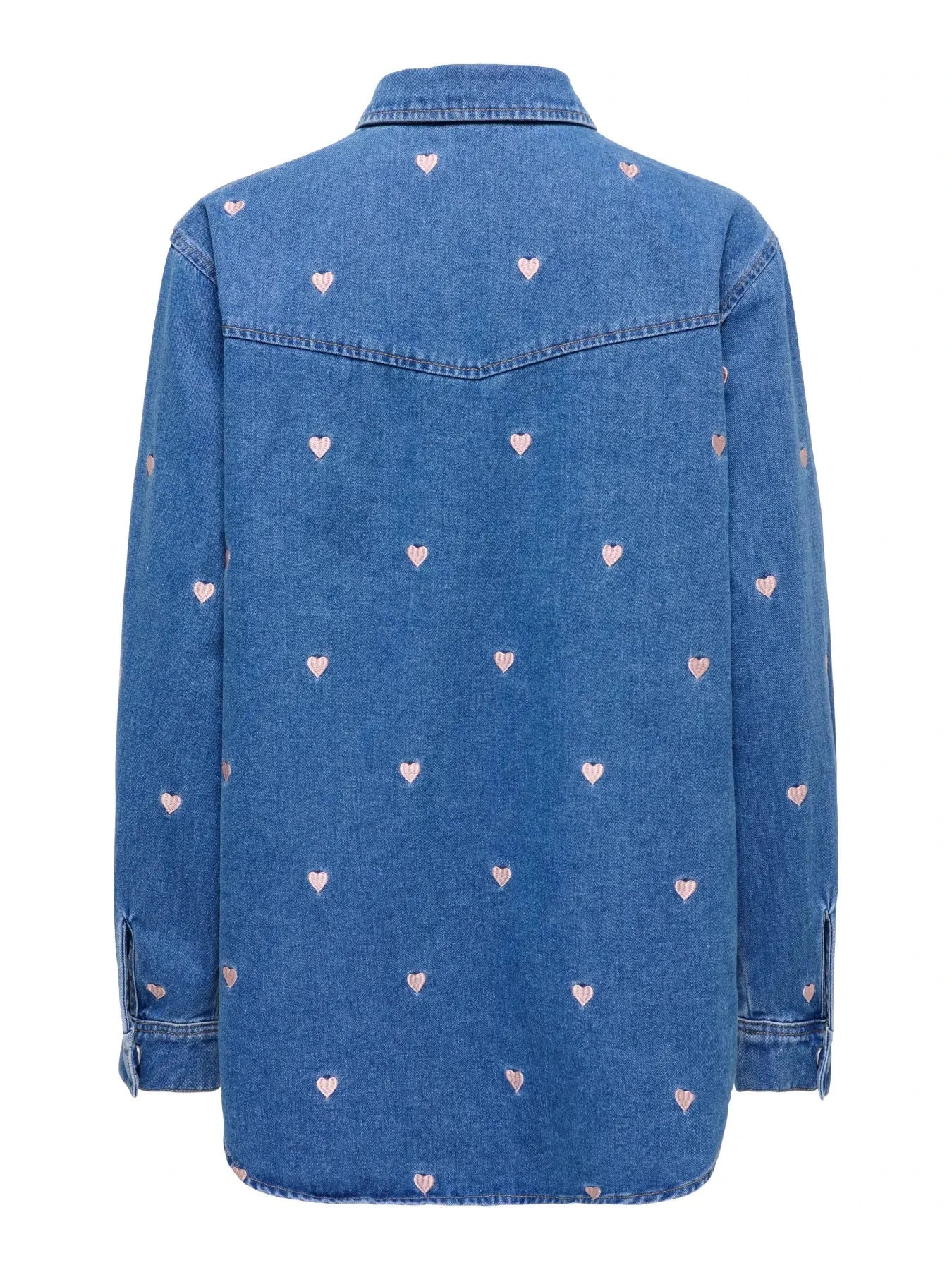 Een denimshirt van Only in een middengrijsblauwe kleur met kleine geborduurde hartjes over de hele stof. Het shirt heeft lange mouwen en een klassieke overhemdkraag.
