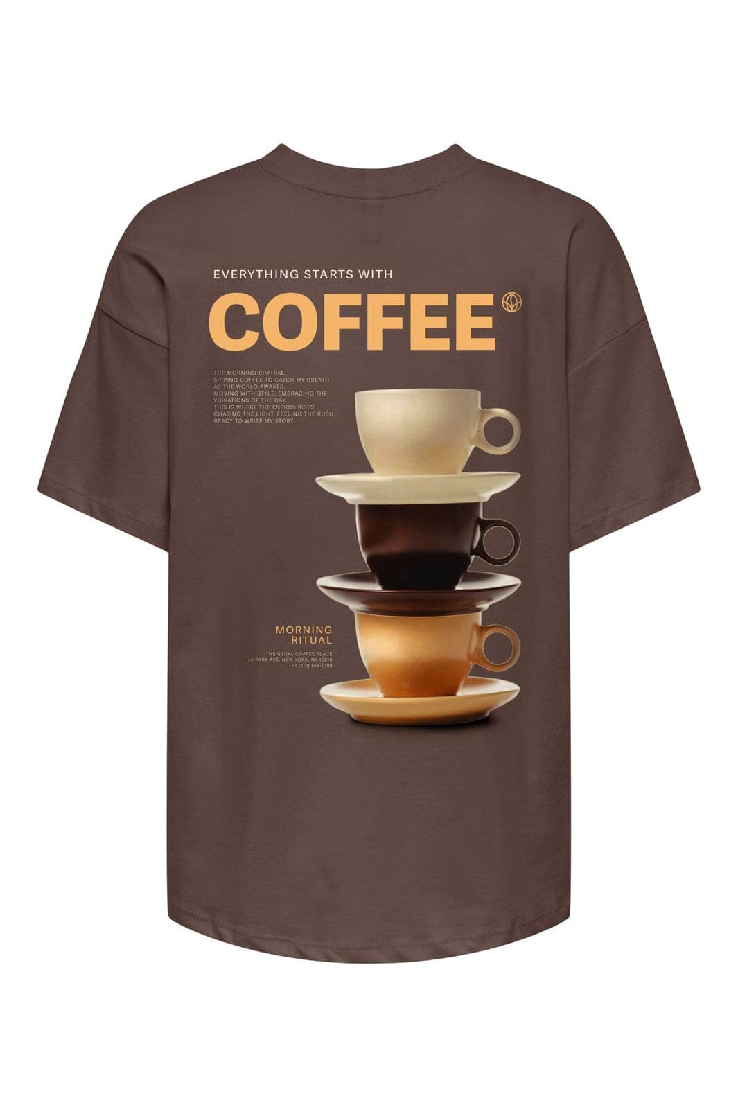 Een chocoladebruin T-shirt van Only, gemaakt van 100% biologisch katoen. De top heeft een bedrukt design met MORNING RITUAL op de voorkant en koffiekopjes op de achterkant.