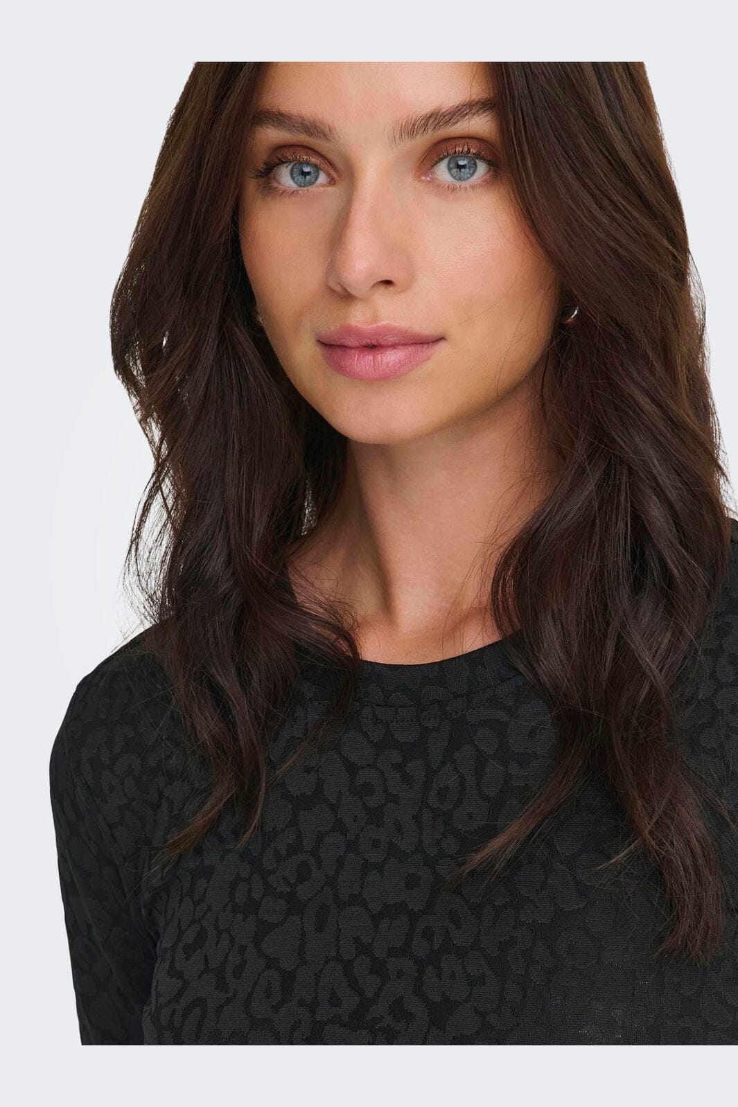 Zwarte langarmtop van Only met ronde hals en luipaardprint. De top heeft een aansluitende pasvorm en is gemaakt van een zachte kwaliteit met stretch, wat het comfortabel maakt om te dragen.