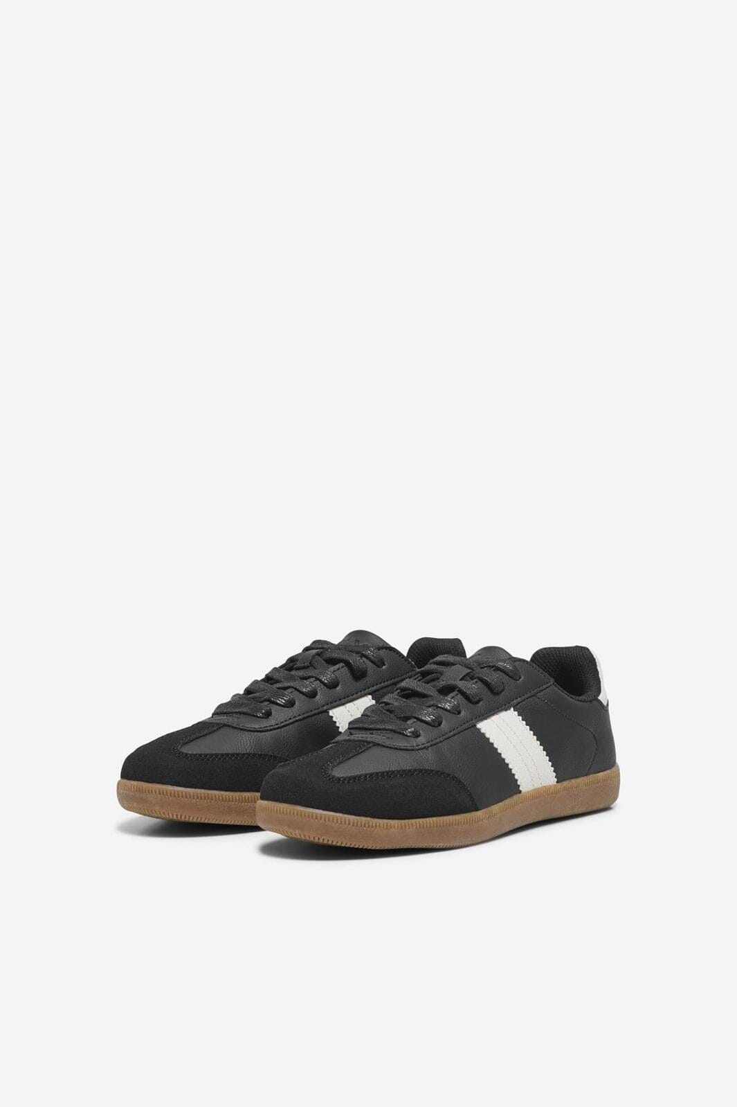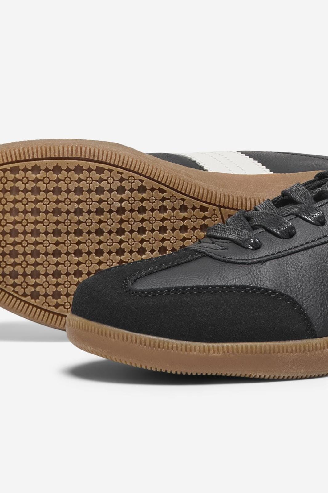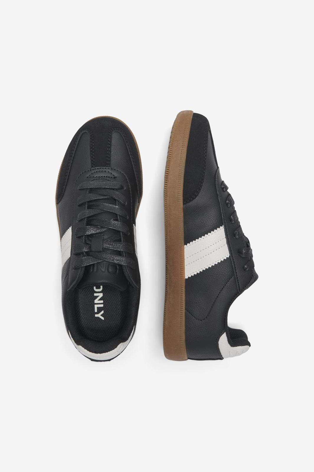 Zwarte sneaker van Only Shoes met witte strepen en veters. De schoen heeft een kurken zool die zich aanpast aan de vorm van de voet en goede schokabsorptie biedt.