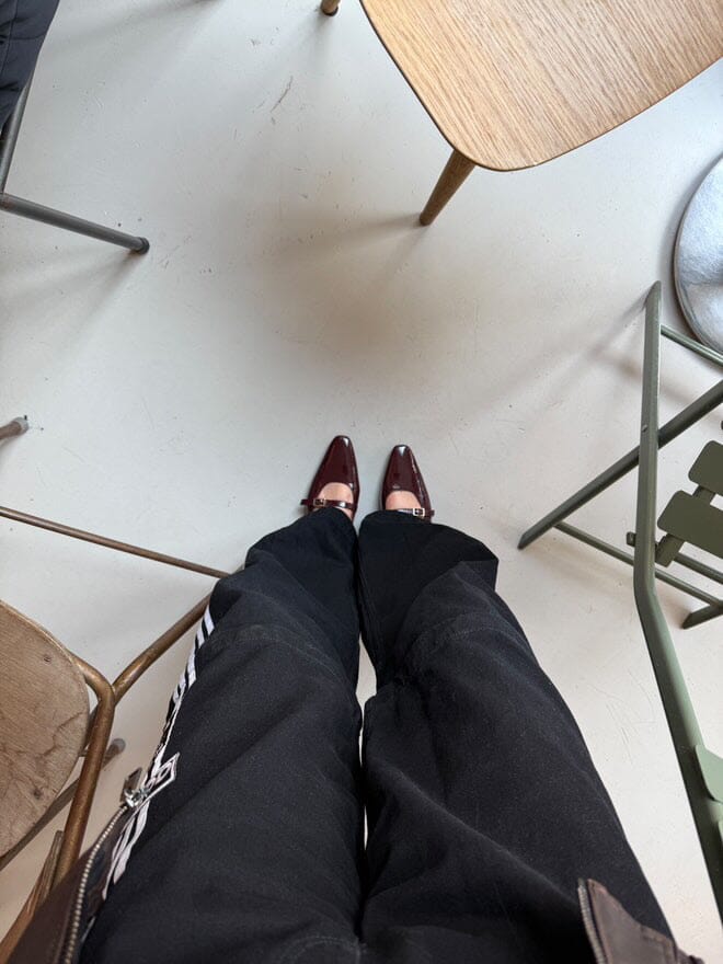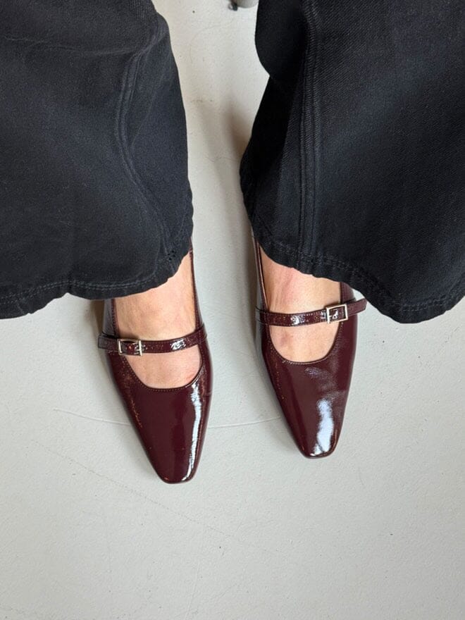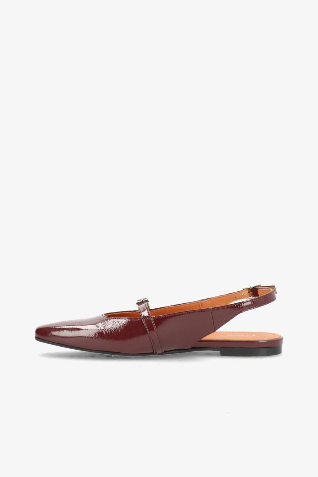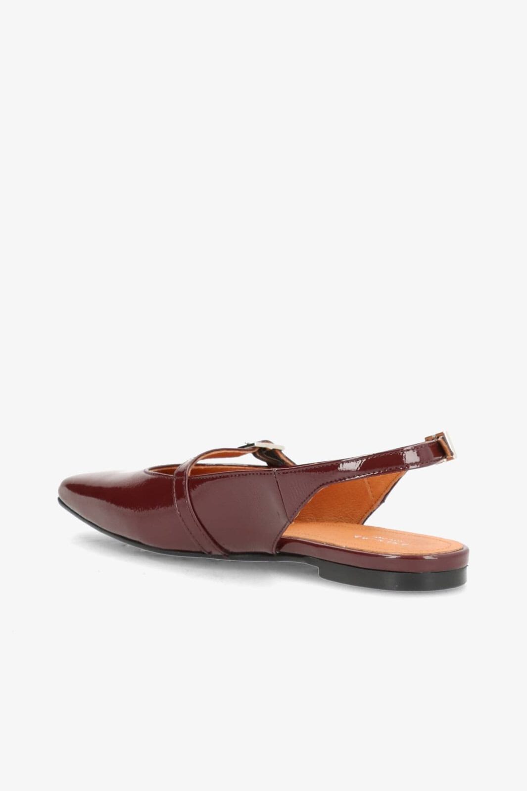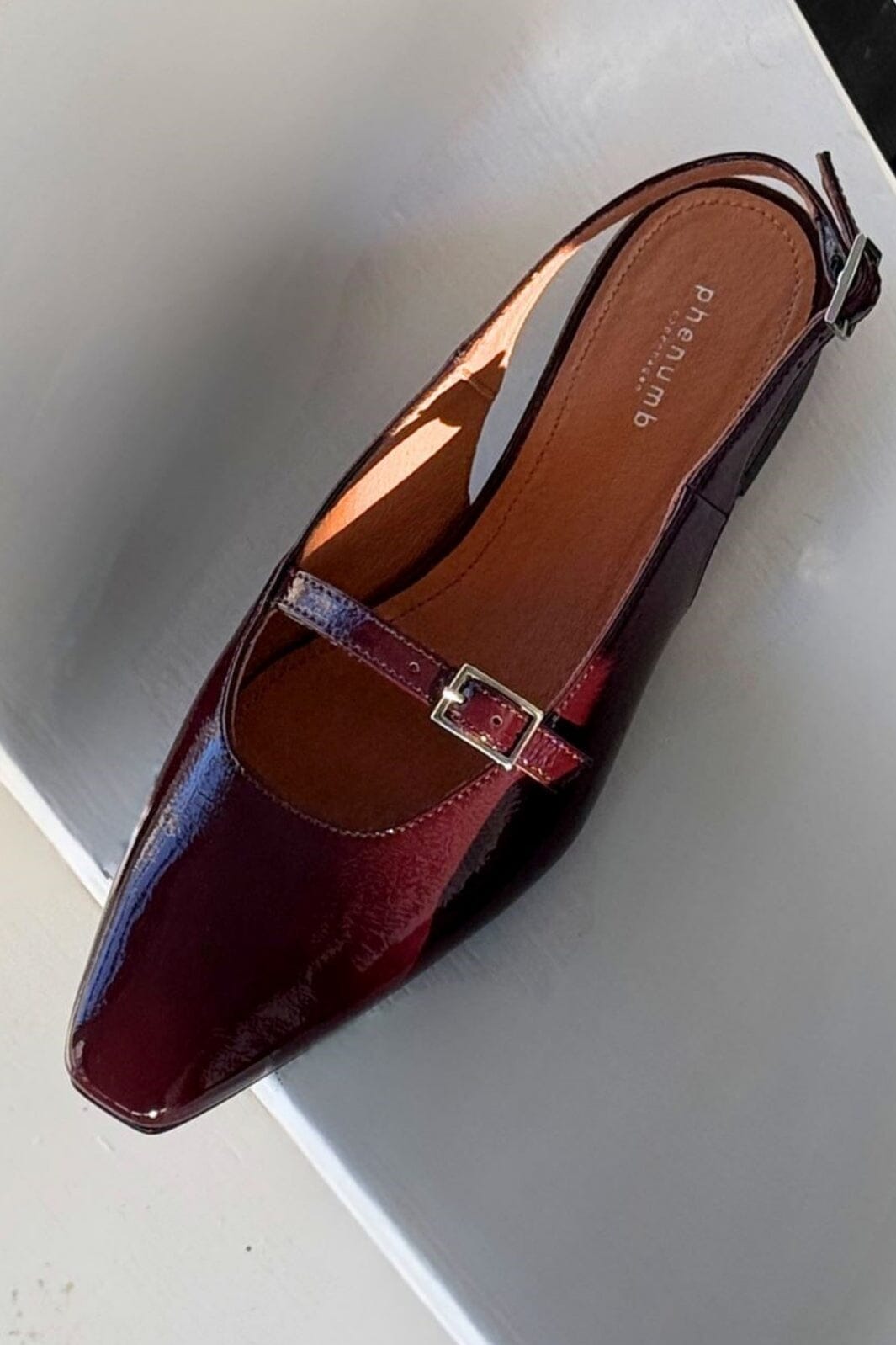 Ballerina's van Phenumb Copenhagen in bordeaux patentleer. De schoen heeft een glanzend oppervlak, een spitse neus en een sluiting met gesp.