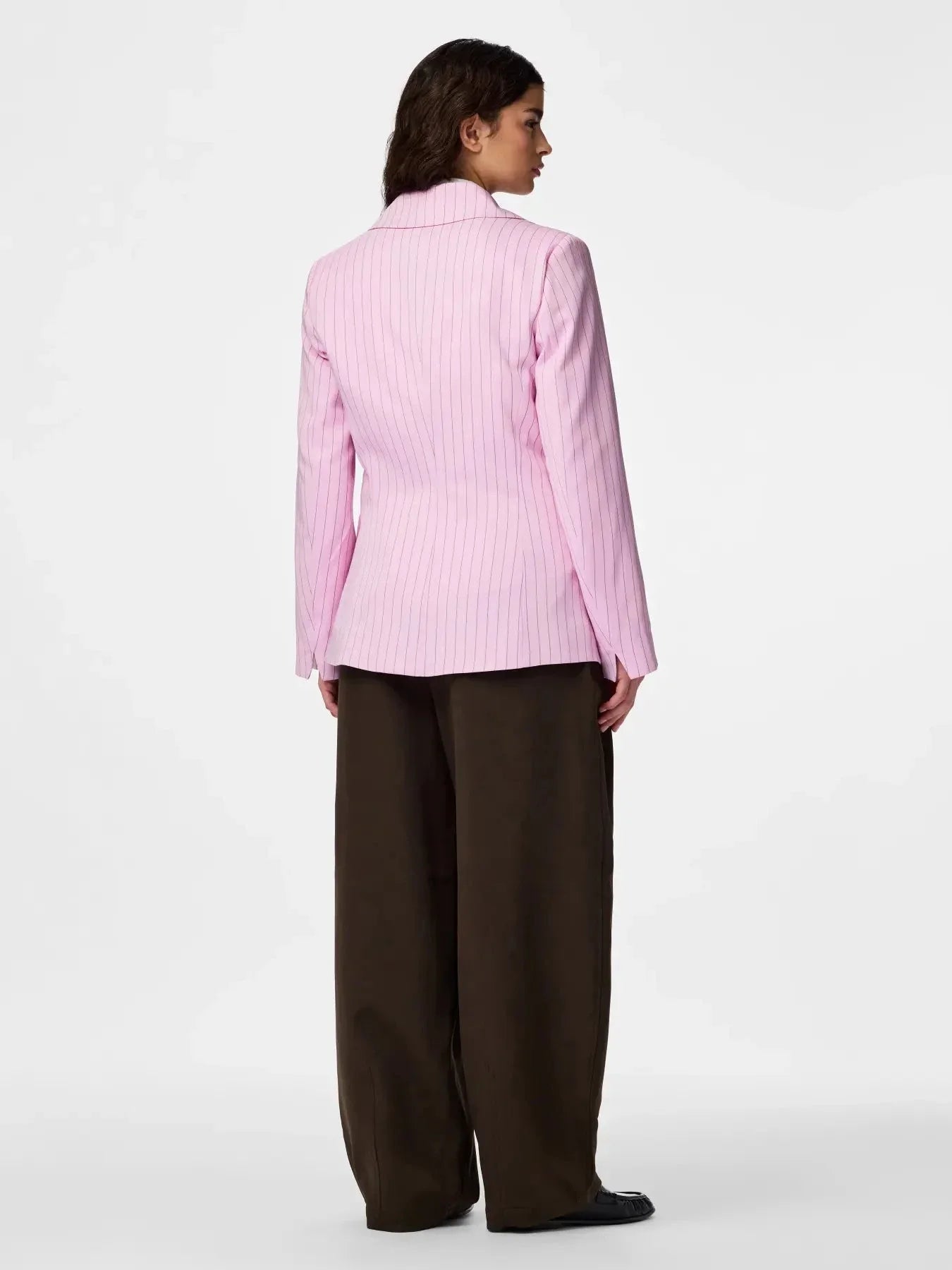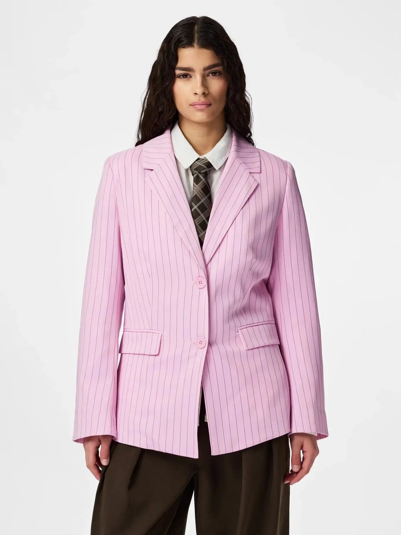 Roze blazer van Pieces met dunne roze strepen over het hele oppervlak. Gemaakt van polyester met elastaan en een zijdezachte afwerking.