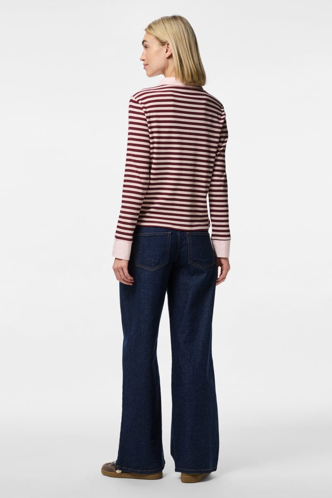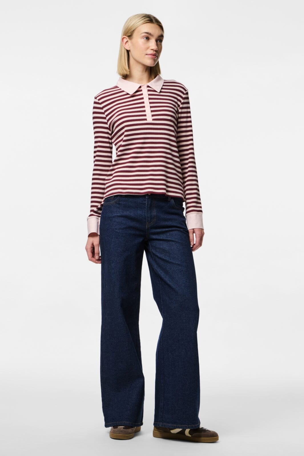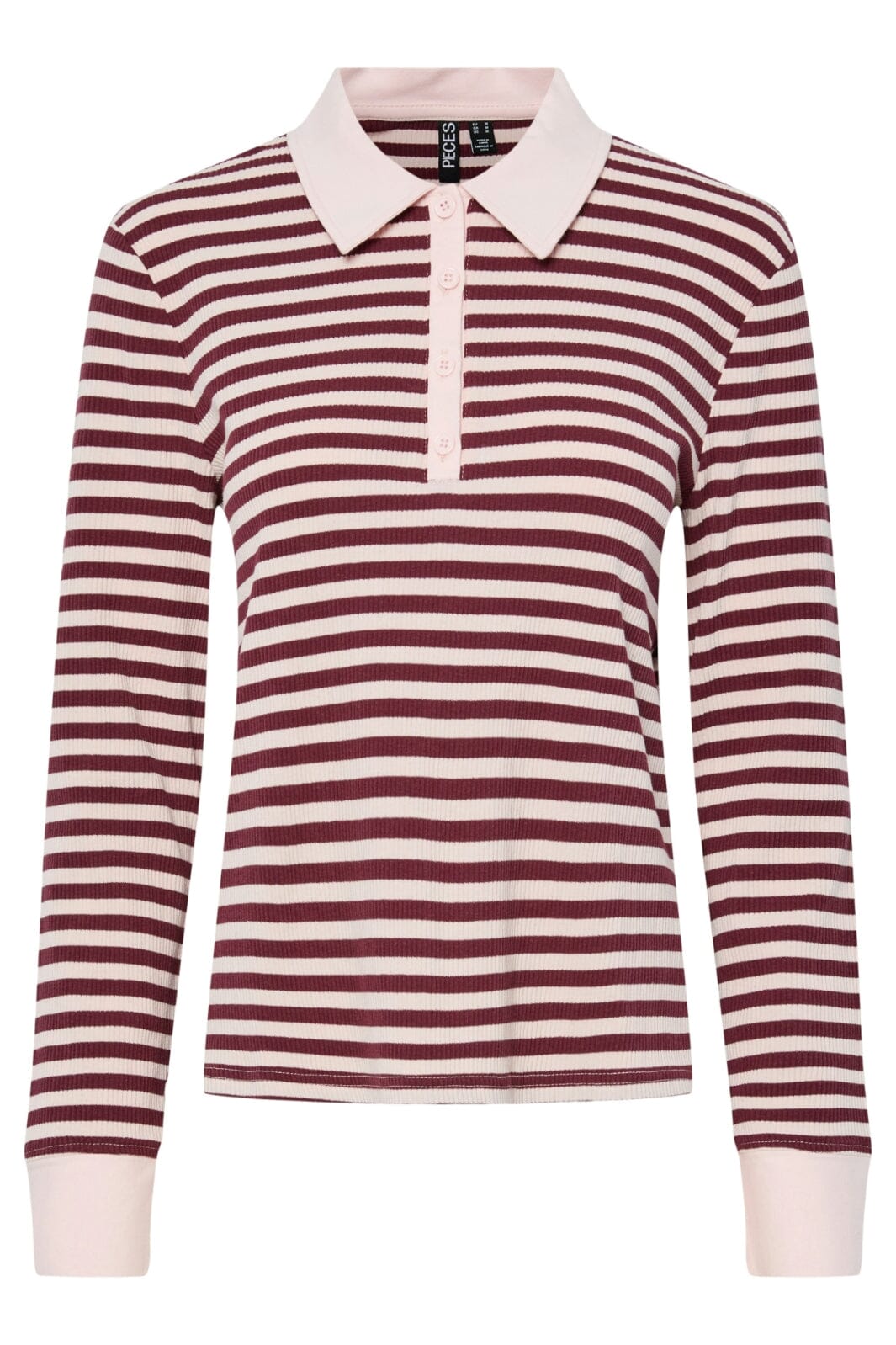 Lange mouwen polo van Pieces in ribbreisel met strepen. De bordeauxrode en roze top heeft een klassieke polokraag met knoopsluiting en ribbing aan de mouwen.