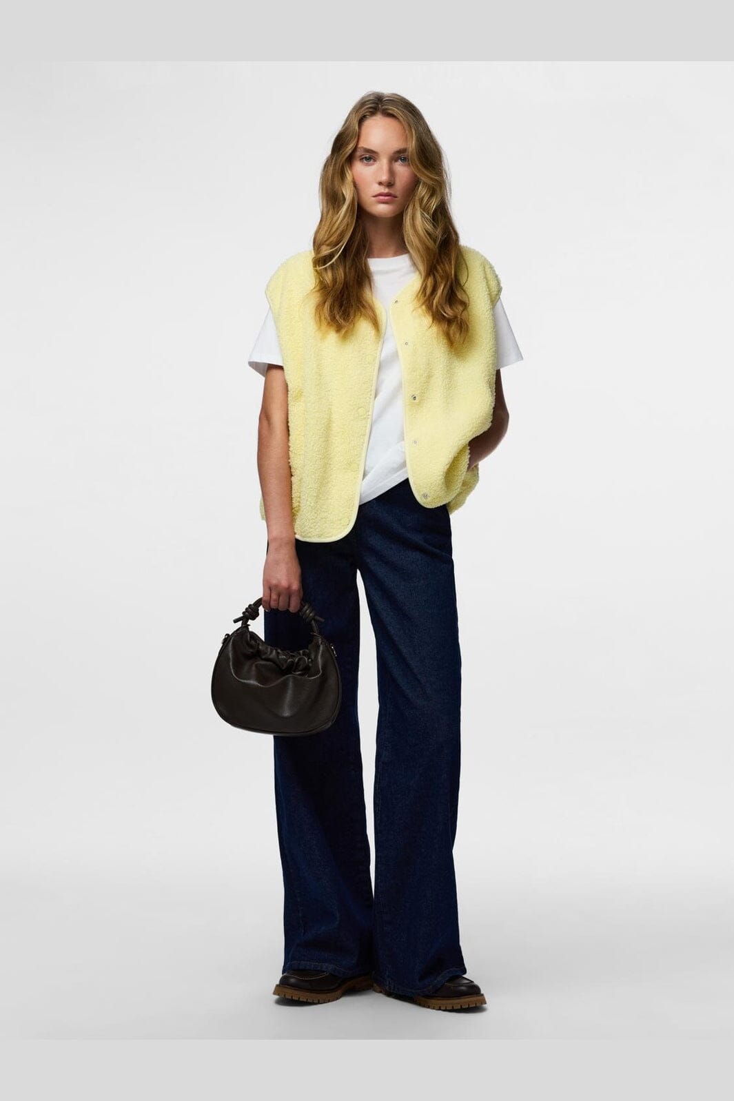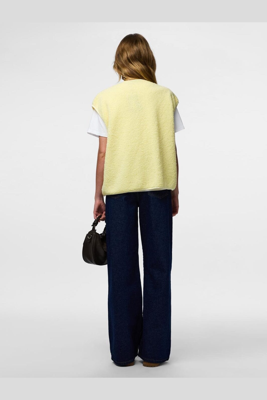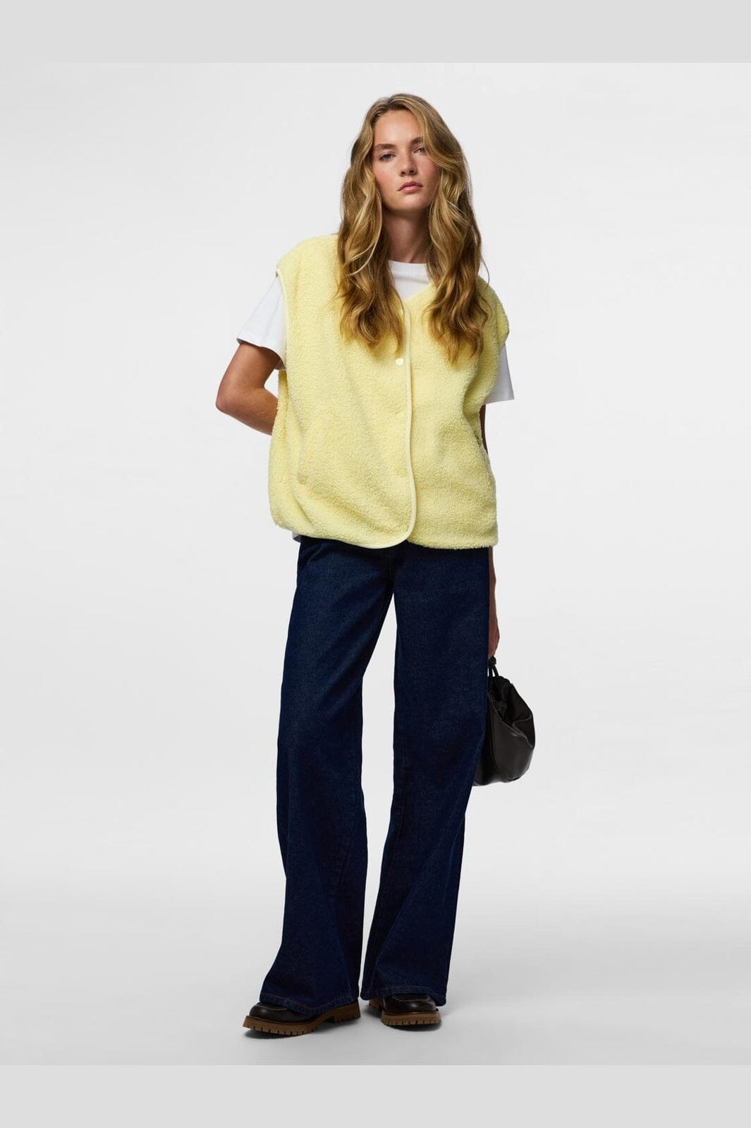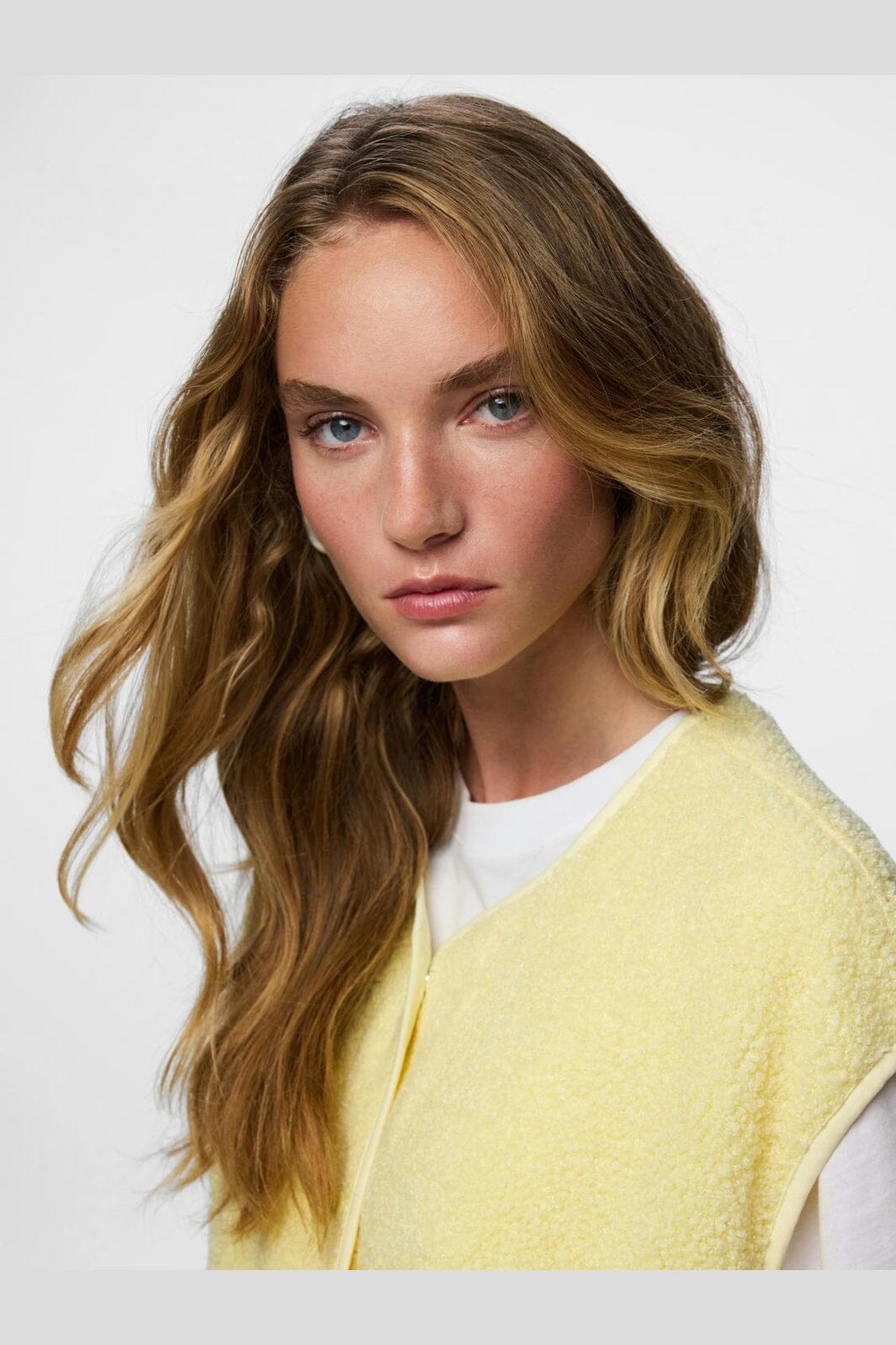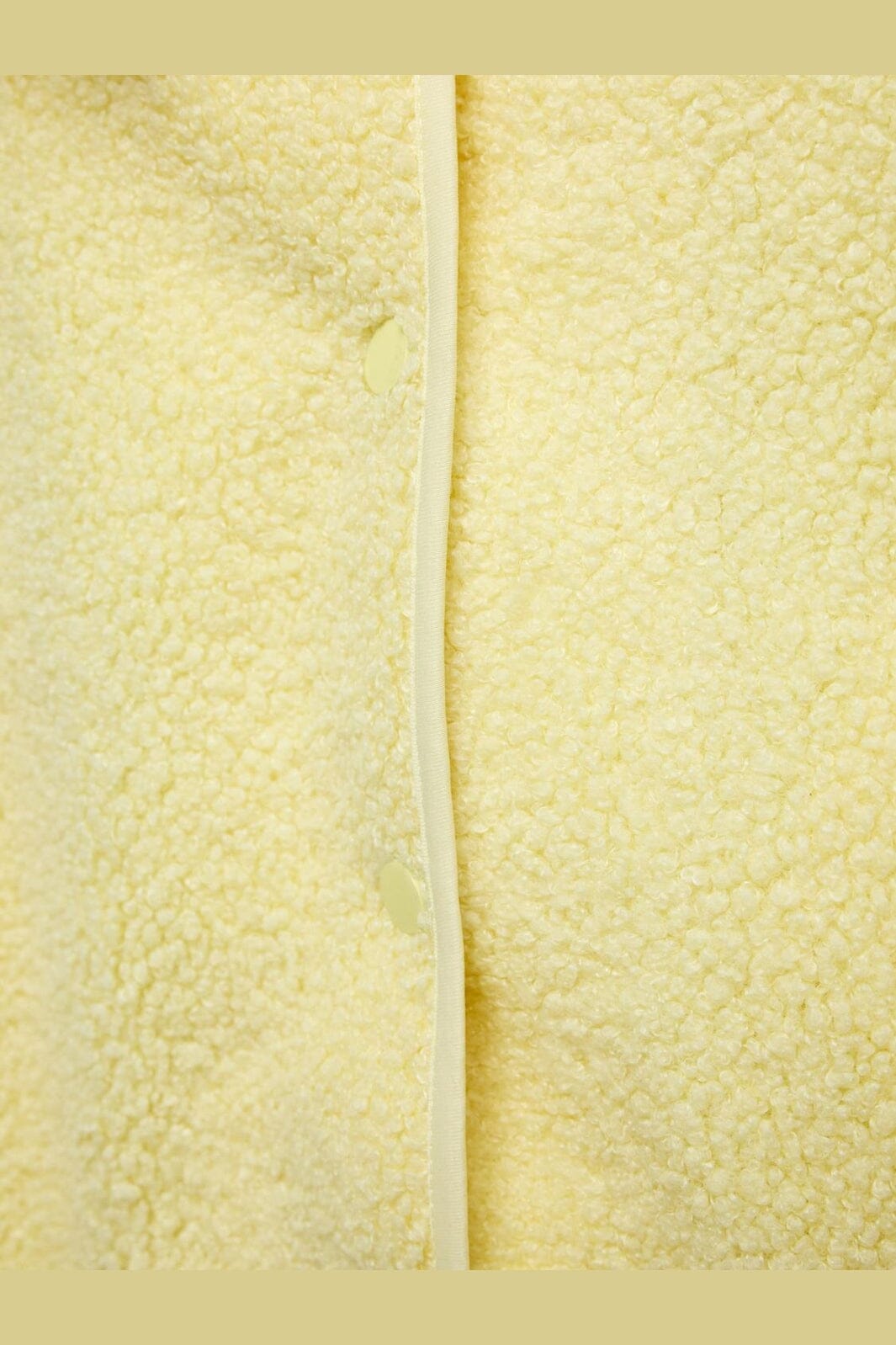 Mouwloos teddyvest van Pieces in de kleur French Vanilla, een lichtgele tint. Het vest heeft een zacht oppervlak en een drukknoopsluiting.