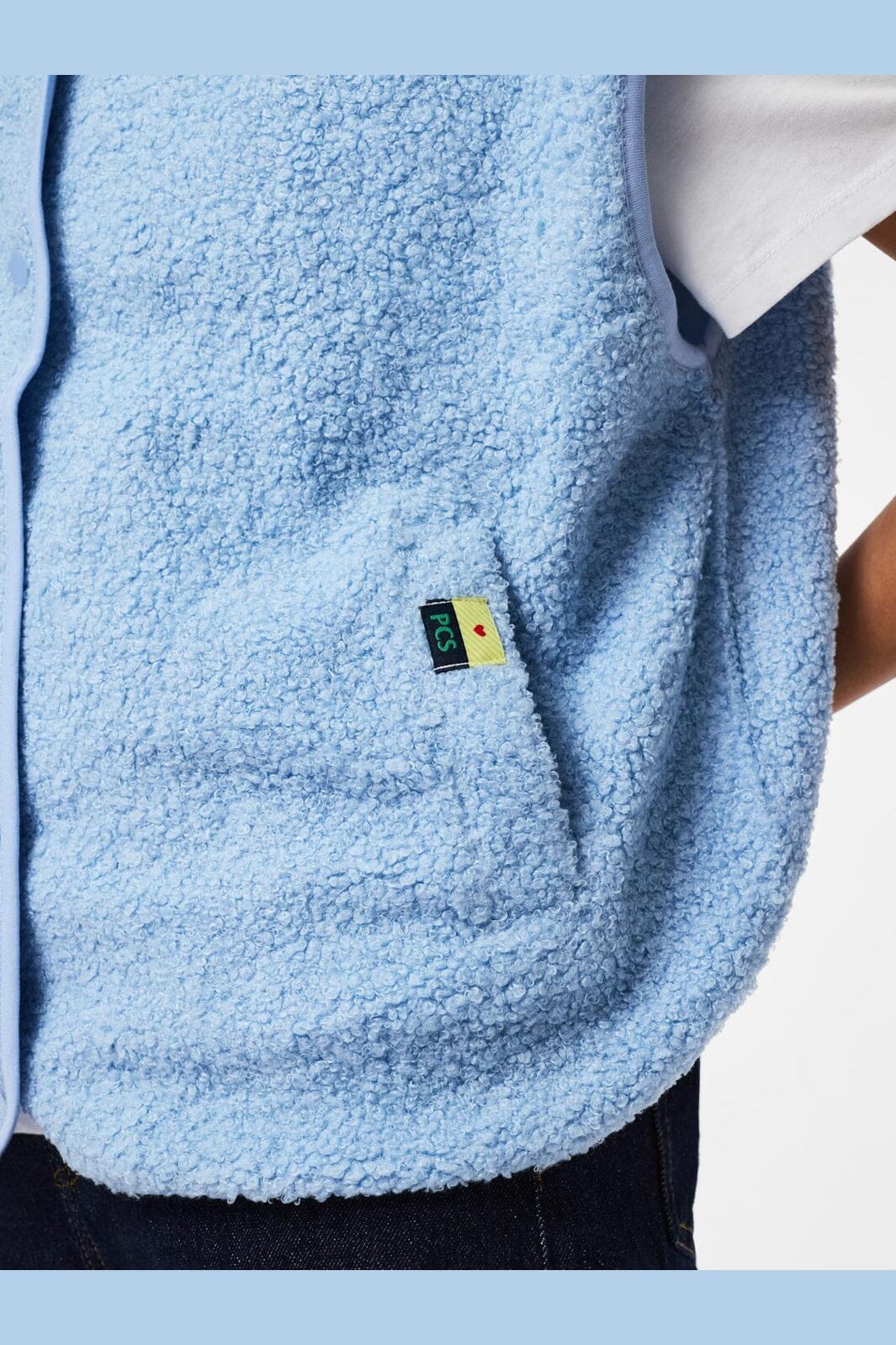 Lichtblauw teddyvest van Pieces, gemaakt van 100% gerecycled polyester met een zacht oppervlak. Het vest heeft een V-hals en een drukknoopsluiting.