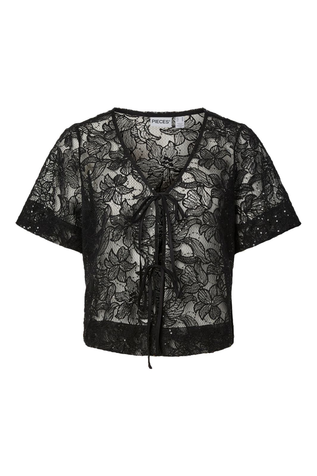 Zwart topje van Pieces met V-hals en bloemkant. De top heeft korte mouwen en een striklint aan de voorkant met pailletten.