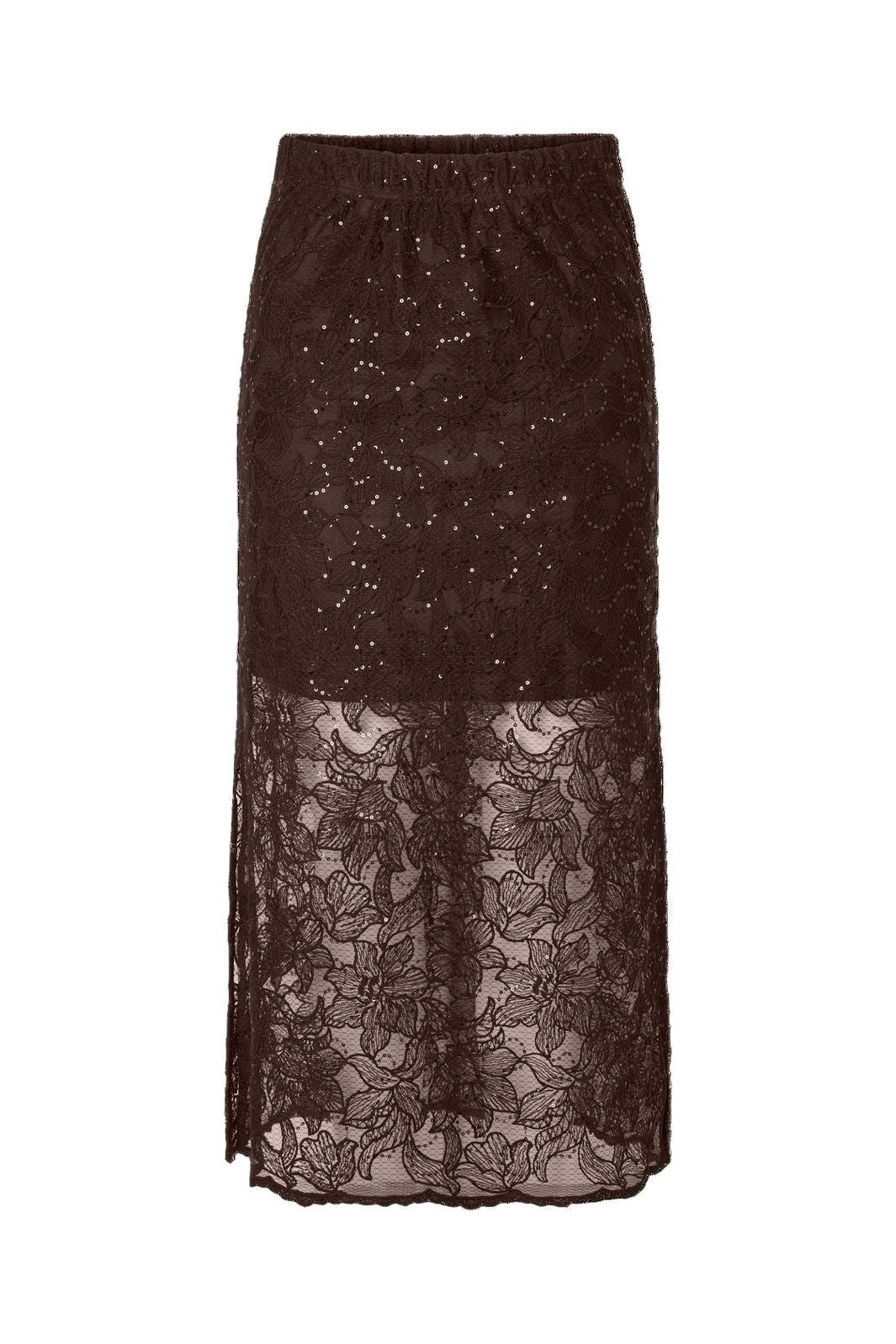 Rok van Pieces in bruin met kleine, glanzende pailletten en een transparante kanten rand aan de onderkant. Het bloemrijke patroon geeft de rok een vrouwelijke uitstraling.