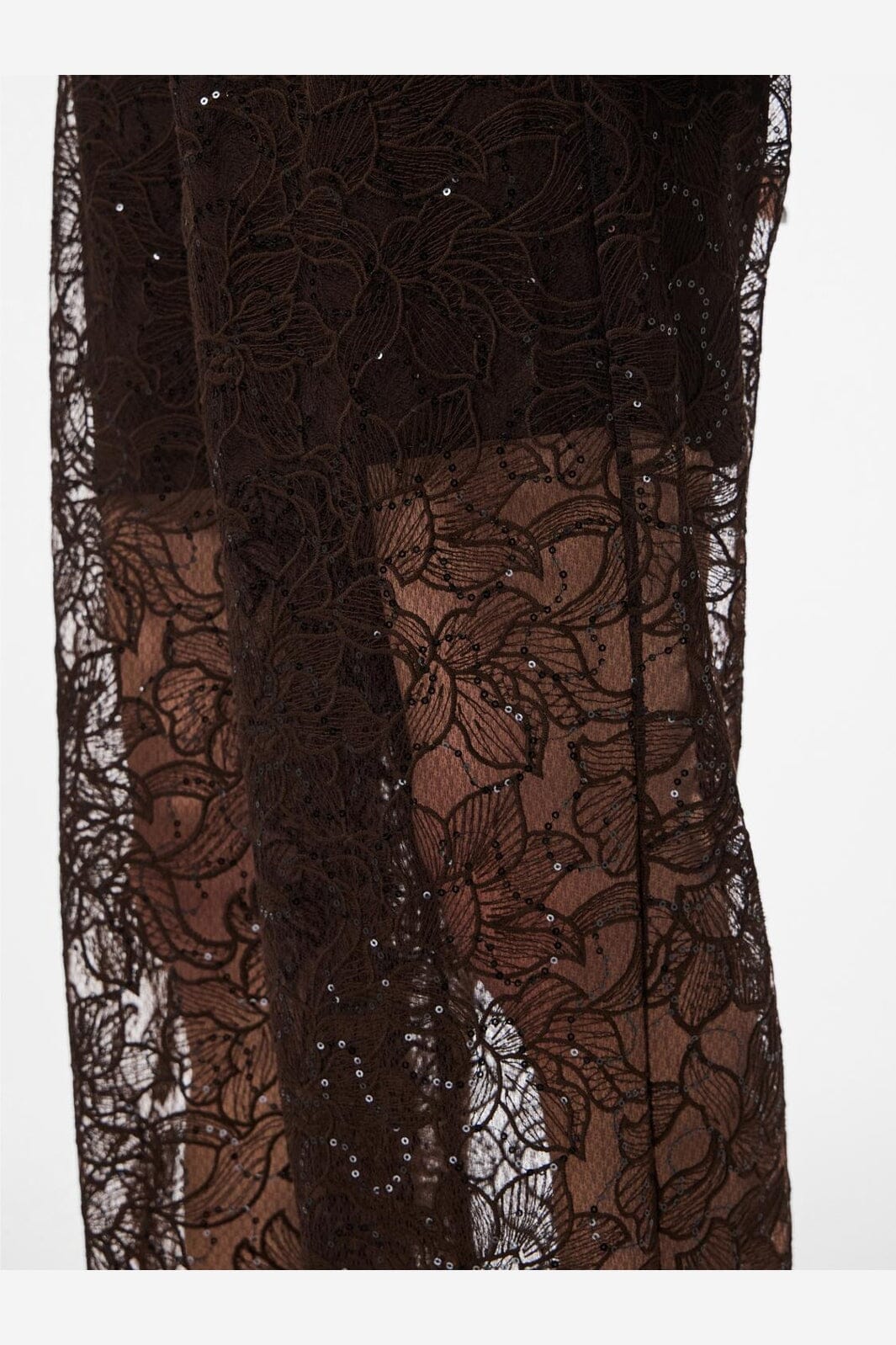 Rechte broek van Pieces, gemaakt van transparant kant met bloemmotief en pailletten in een donkerbruine tint.