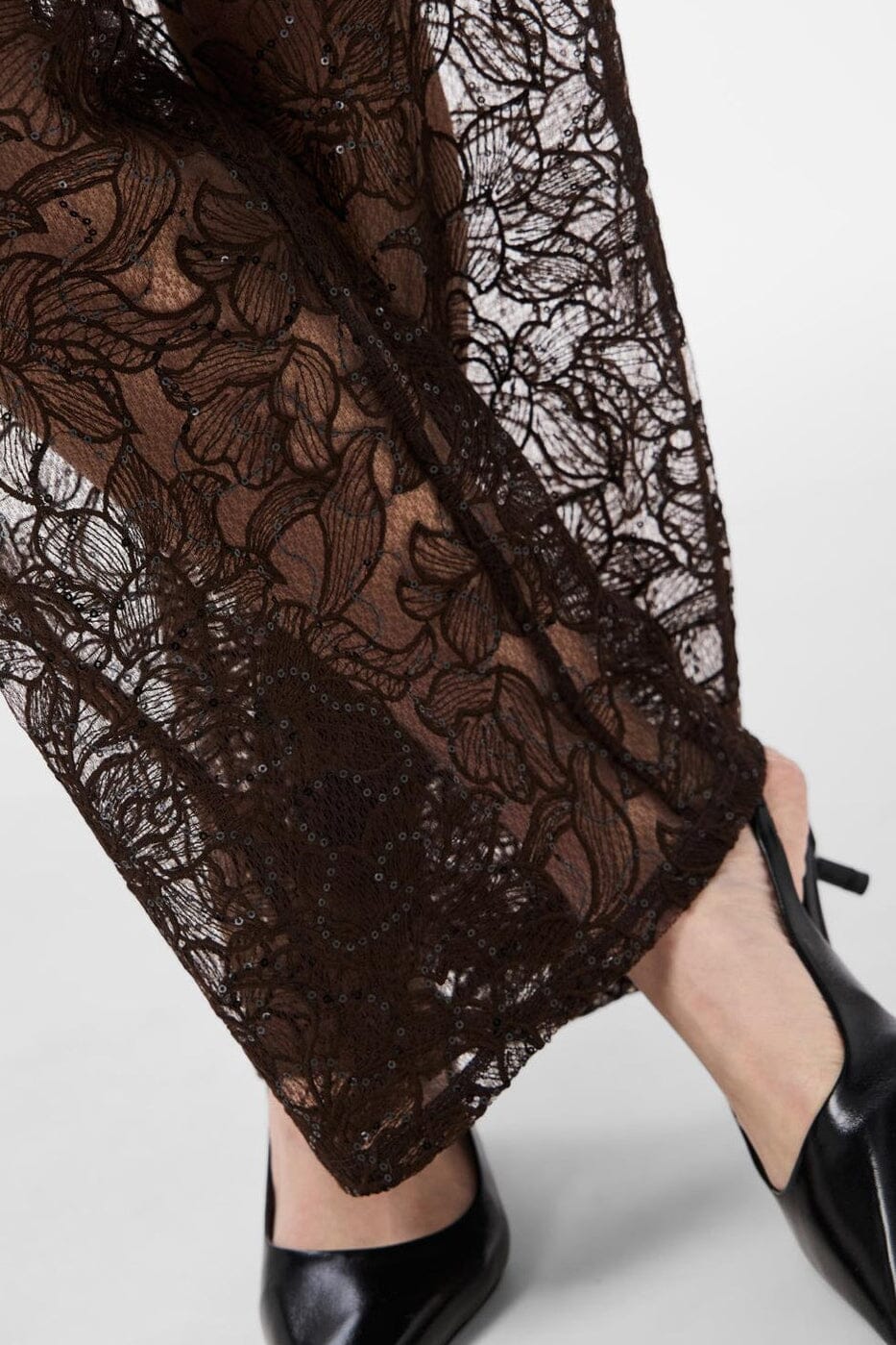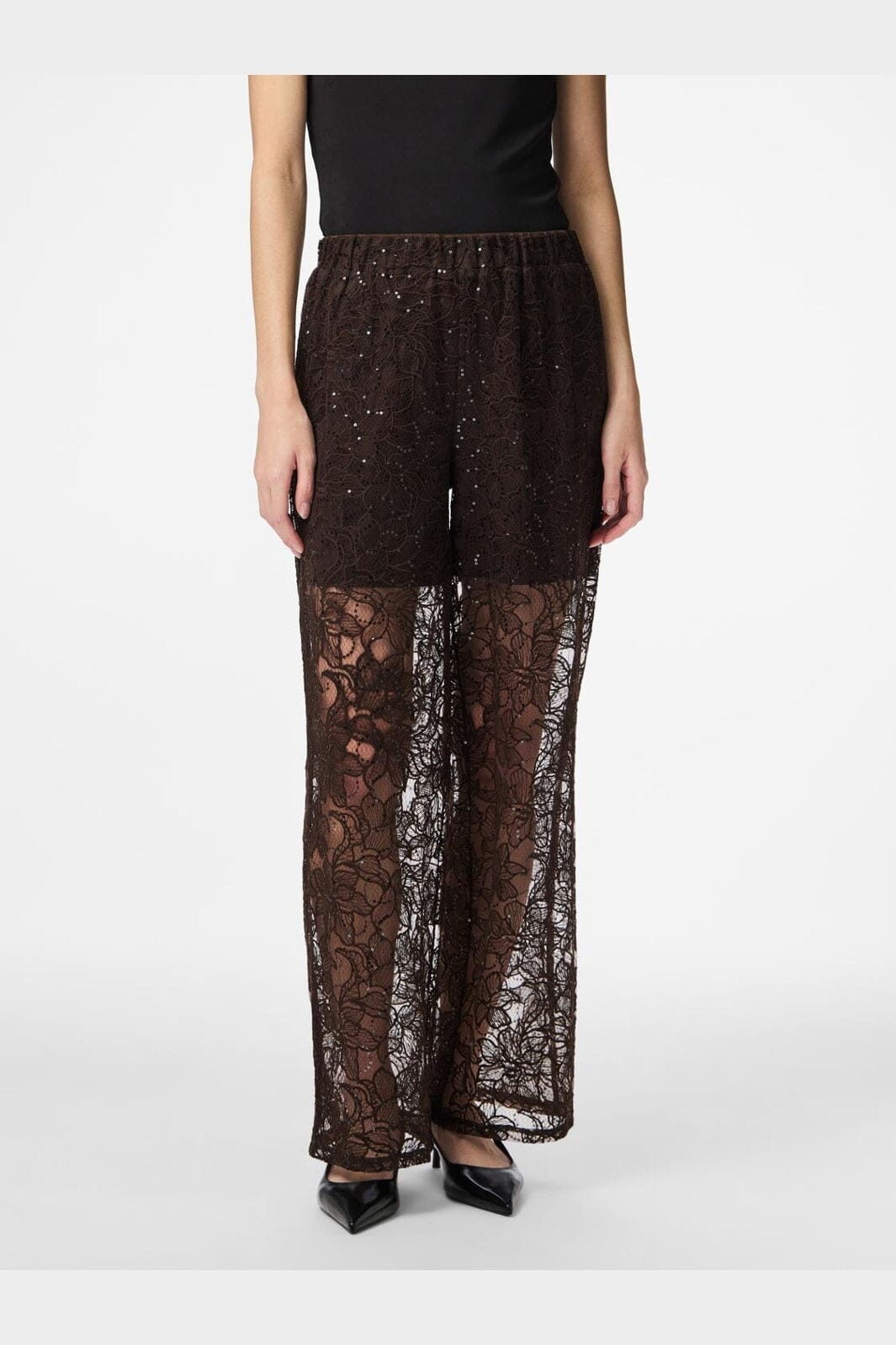 Rechte broek van Pieces, gemaakt van transparant kant met bloemmotief en pailletten in een donkerbruine tint.
