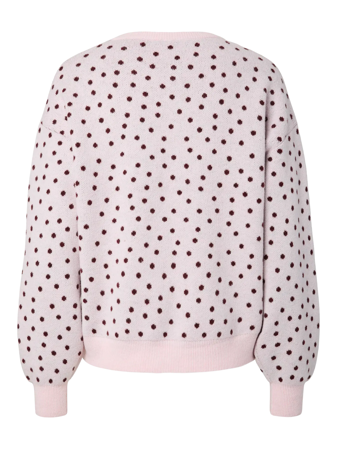 Gebreide trui van Pieces in roze met donkerrode stippen. De trui heeft een ronde halslijn en ribboorden bij de polsen en aan de onderkant.