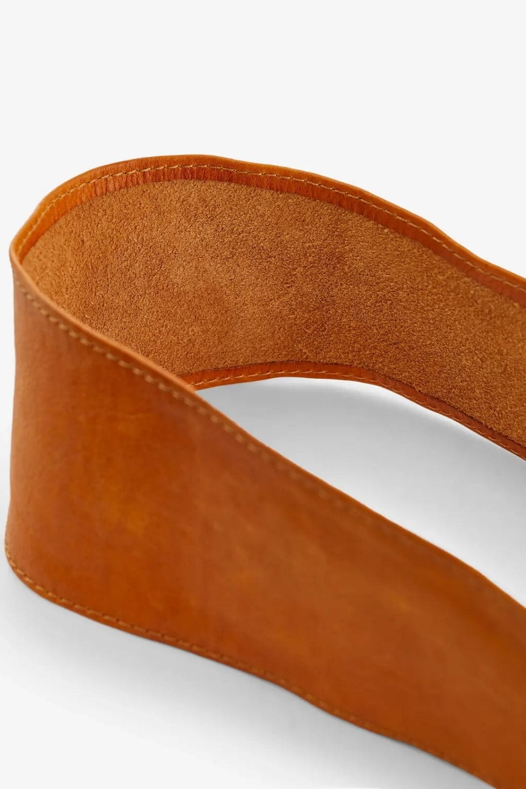 Riem van Pieces in buffelleer met bindband. De bruine cognackleur en het zachte leer geven de riem een rustieke uitstraling. De riem heeft een brede band met dubbelgestikte randen.