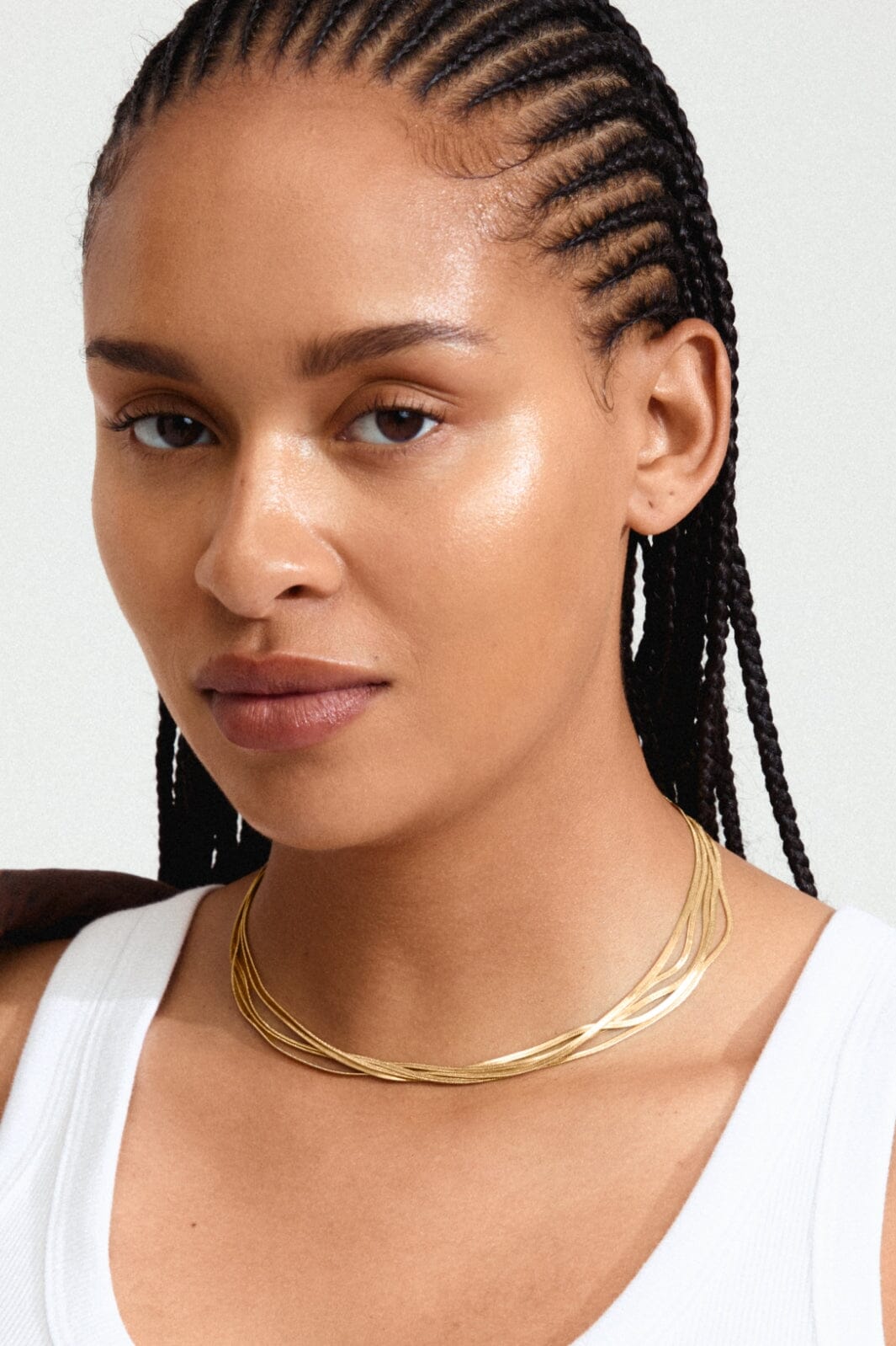 Goudplated halsketting van Pilgrim met meerdere strengen. Het glanzende oppervlak weerkaatst het licht en creëert diepte in het ontwerp. De halsketting heeft een mooie gouden kleur.
