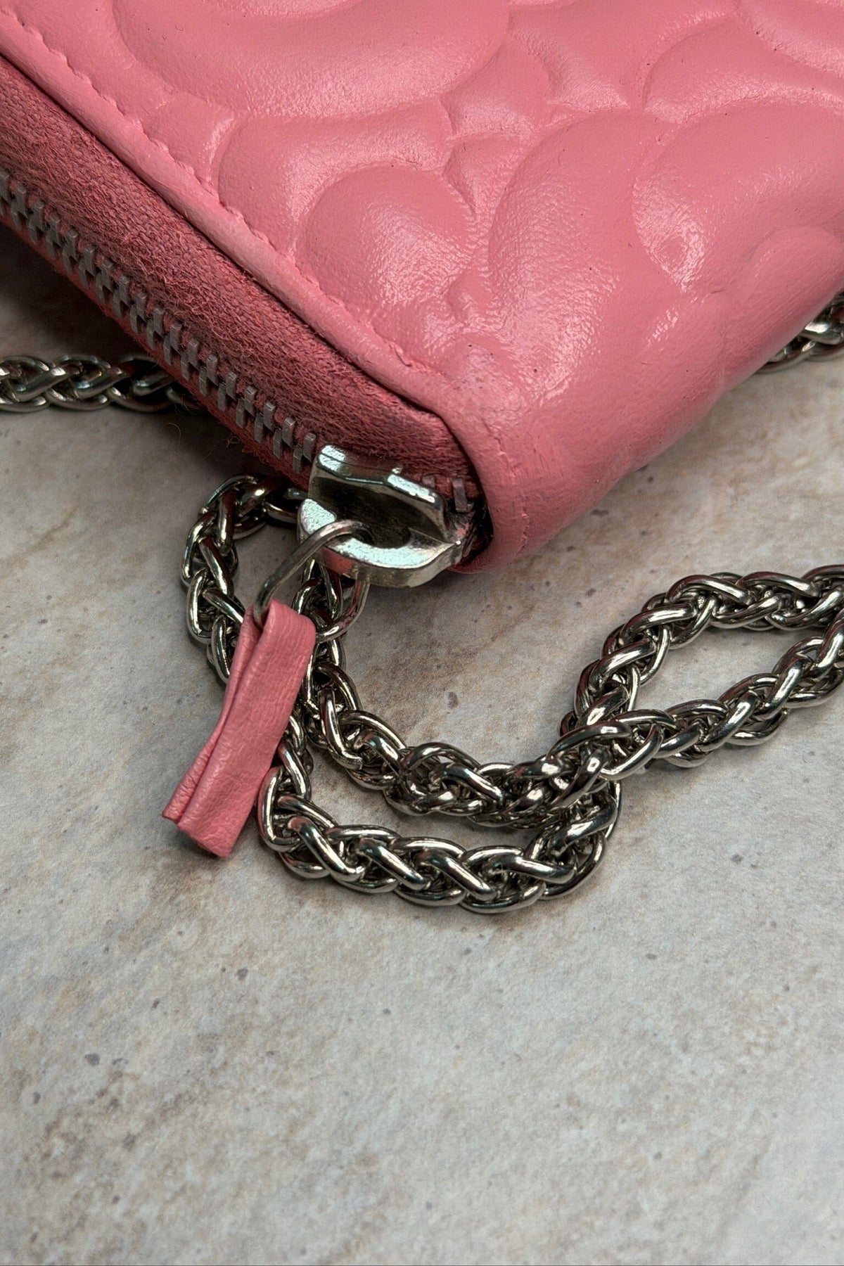Roze portemonnee van Chanel met bloemmotief en kettingriem. Het product komt uit de Preloved Vintageline x Molly&My en is in een goede, maar gebruikte staat.