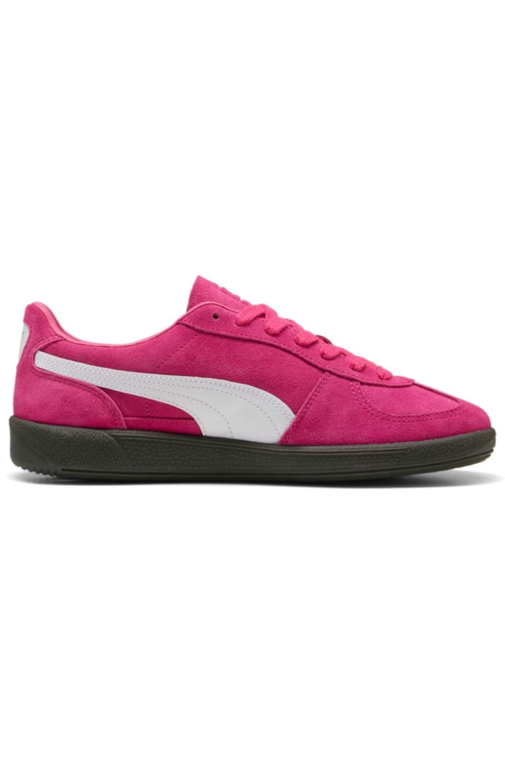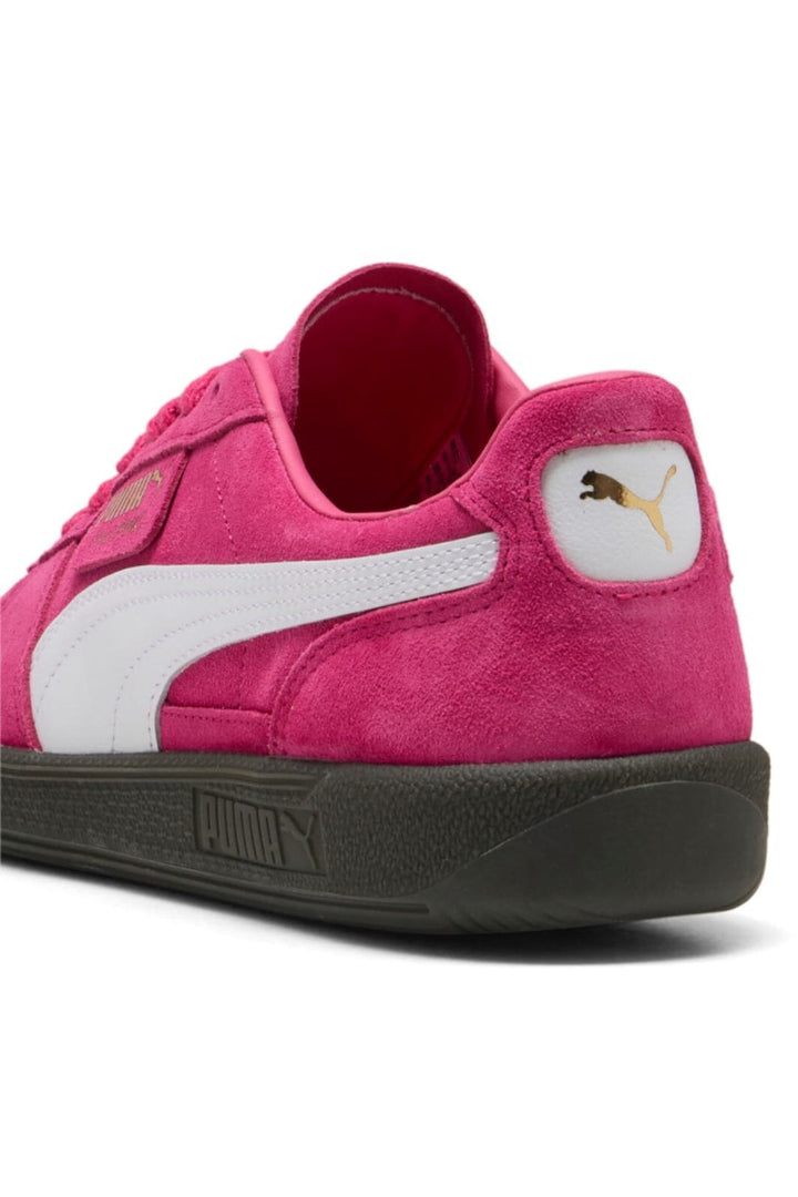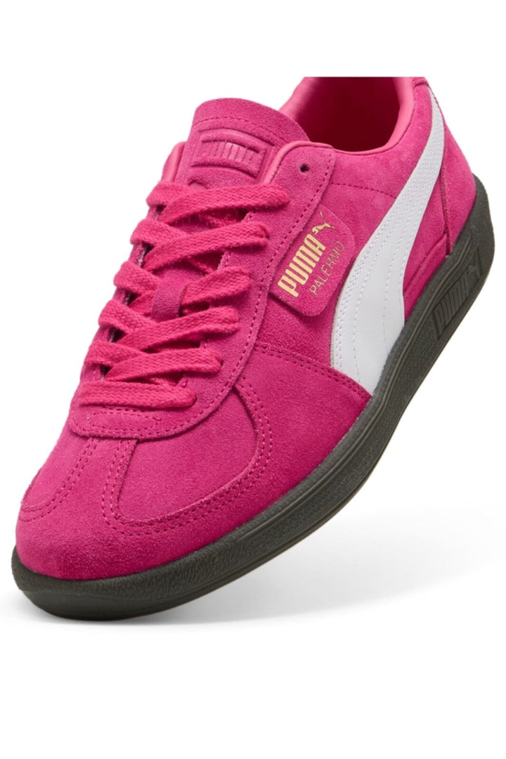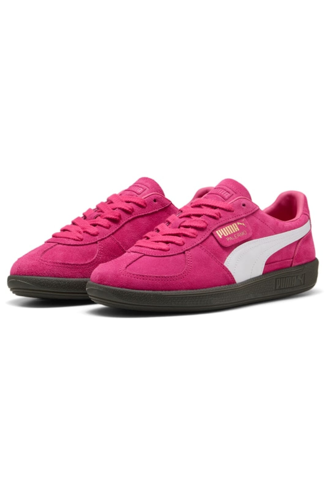 Roze sneakers van Puma met witte details. De schoenen hebben een bovenwerk van leer en een zwarte rubberen zool die goede ondersteuning biedt aan de voet.