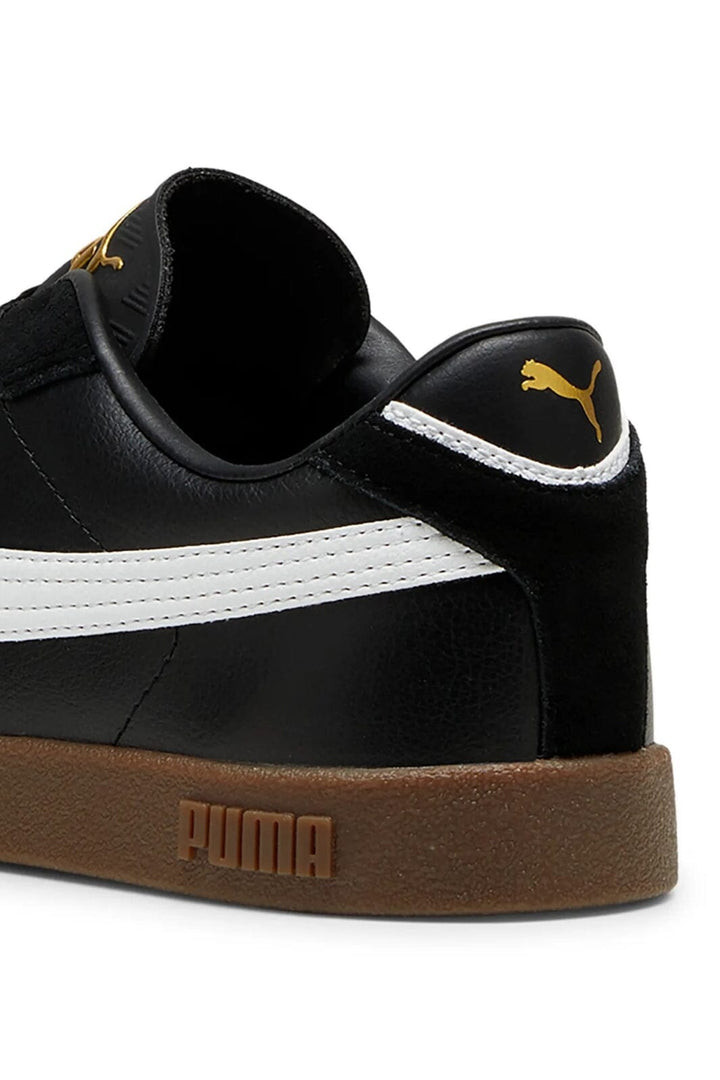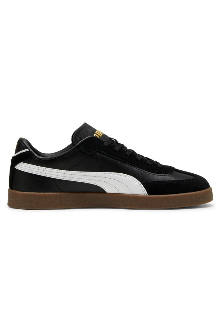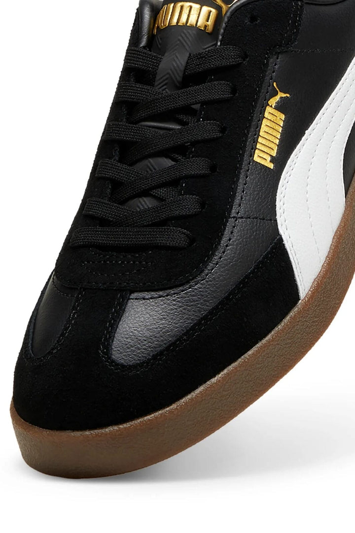 Zwarte sneakers van Puma met witte streep en gouden details. De schoenen hebben een klassieke silhouet met een ronde neusvorm en vetersluiting die zorgt voor een veilige pasvorm.